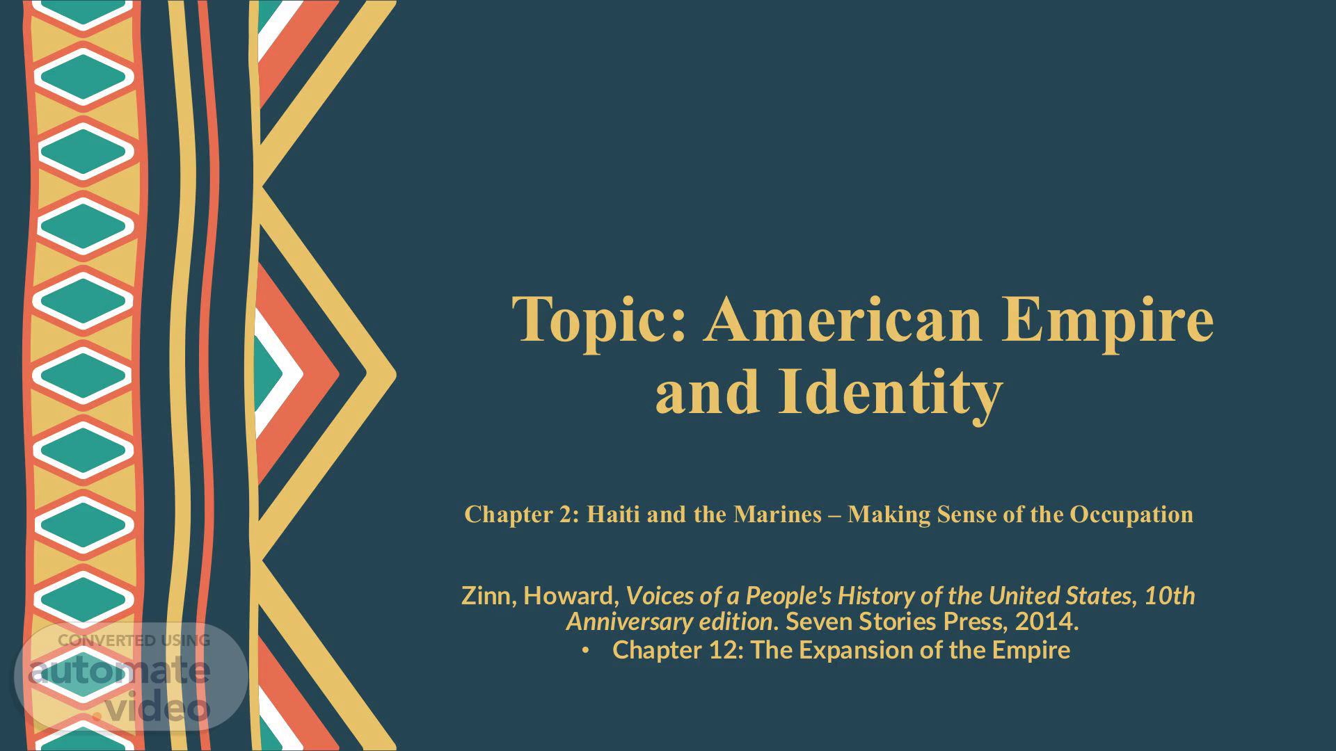 [Audio] Topic: American Empire and Identity Chapter 2: Haiti and the Marines – Making Sense of the Occupation Zinn, Howard, Voices of a People's History of the United States, 10th Anniversary edition. Seven Stories Press, 2014. Chapter 12: The Expansion of the Empire.