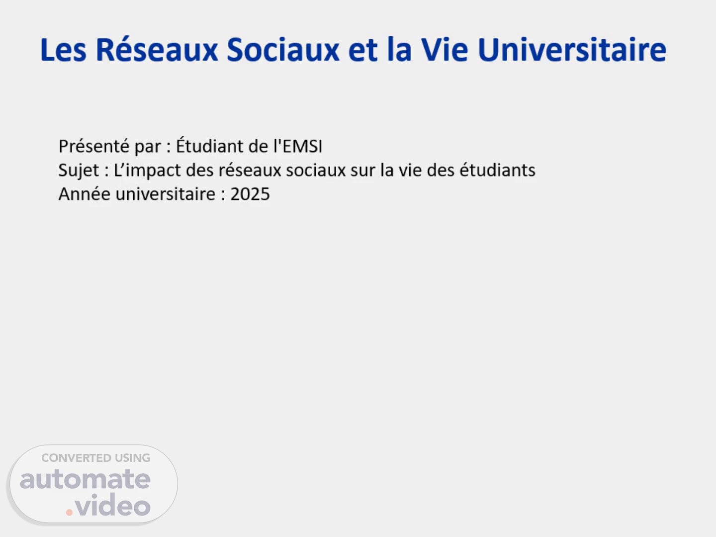 [Audio] Bonjour à tous, bienvenue à cette présentation sur l'impact des réseaux sociaux sur la vie universitaire. Je suis enthousiaste de vous présenter ce sujet en tant qu'étudiant de l'École Marocaine des Sciences de l'Ingénieur. Nous allons explorer ensemble l'essentiel des réseaux sociaux dans notre quotidien et discuter de l'importance d'une utilisation équilibrée et responsable. Pour commencer, nous allons nous projeter en 2025 et nous concentrer sur l'évolution du rôle des réseaux sociaux dans le milieu universitaire. Merci de votre présence et de votre attention..