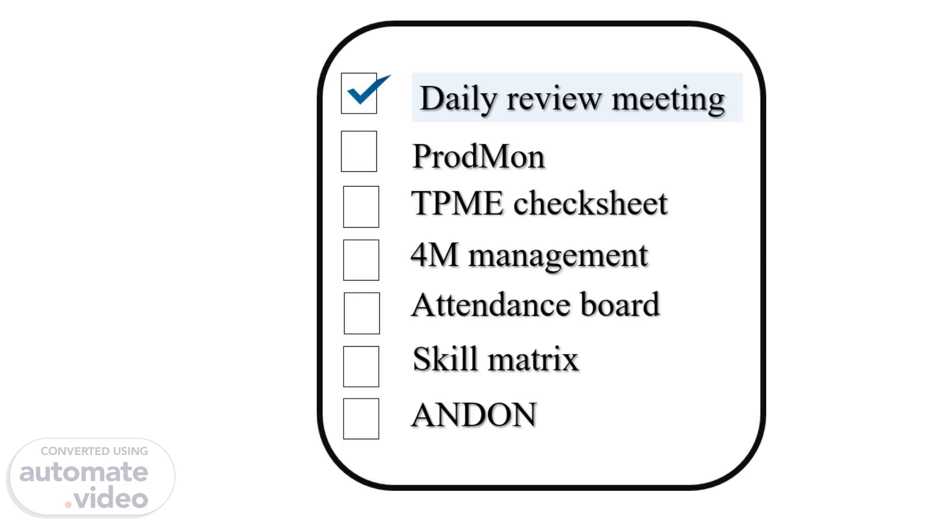 [Audio] The daily review meeting discusses the current state of the production monitoring system using the TPME checklist to ensure optimal performance. This involves reviewing the 4M management process, attendance board, skill matrix, and ANDON system to identify any issues or areas for improvement and take corrective action..