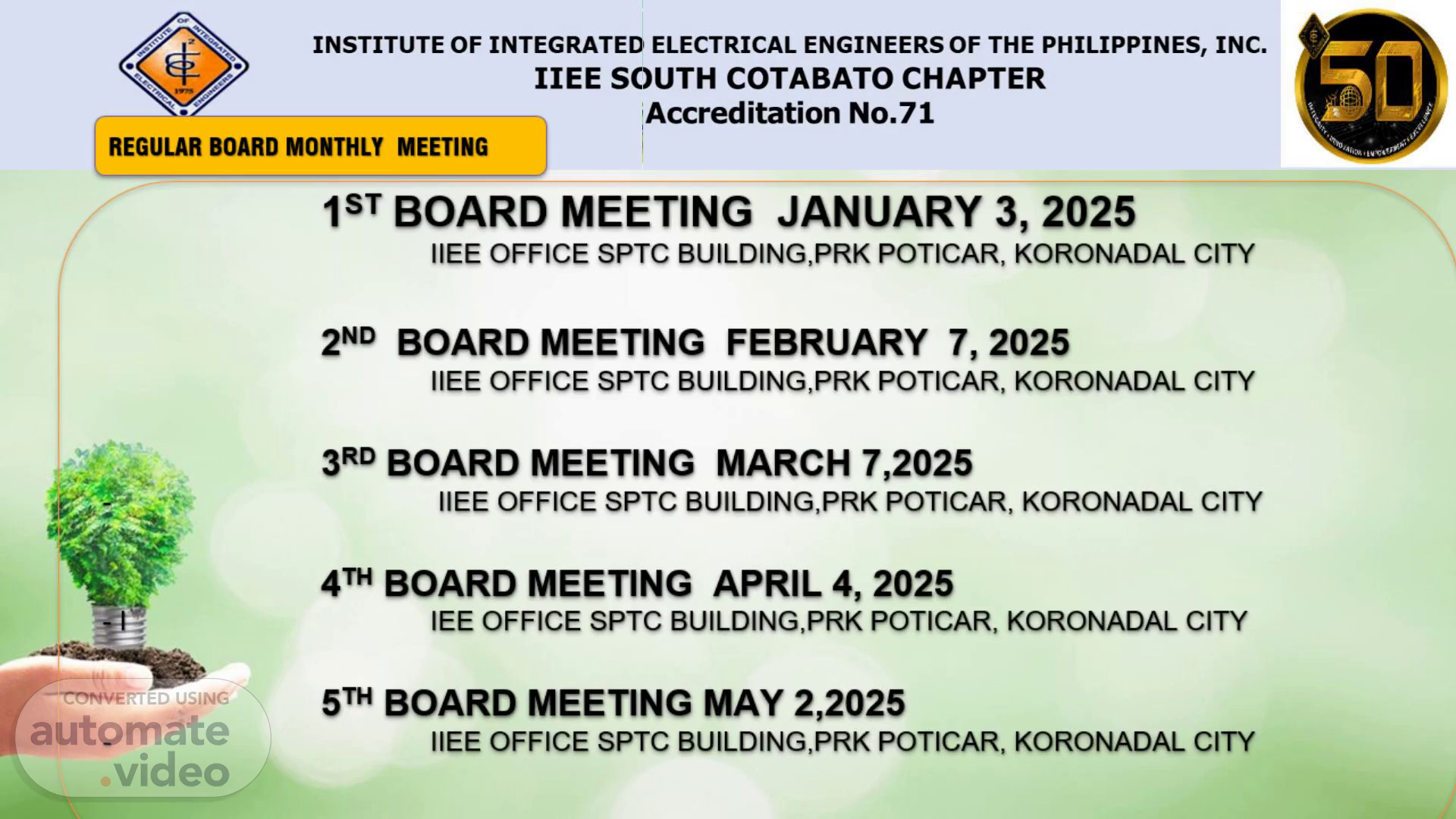[Audio] Our 50th anniversary in 2025 marks a momentous occasion for the IIEE South Cotabato Chapter. Today, we gather for our 6th board meeting at the IIEE office in SPTC building, Prk Poticar in Koronadal City. Our next meeting on July 4, 2025 will be held online, followed by our 8th board meeting on August 1, 2025 at the IIEE office in SPTC building, Prk Poticar. Our 9th board meeting on September 4, 2025 will take place at DABS Resto House in Prk. Romsiville, Koronadal City. These meetings are essential in our preparations for the celebration of our 50th anniversary. We encourage everyone to actively participate and contribute their ideas and suggestions. Let's work together to strengthen and uplift our chapter..