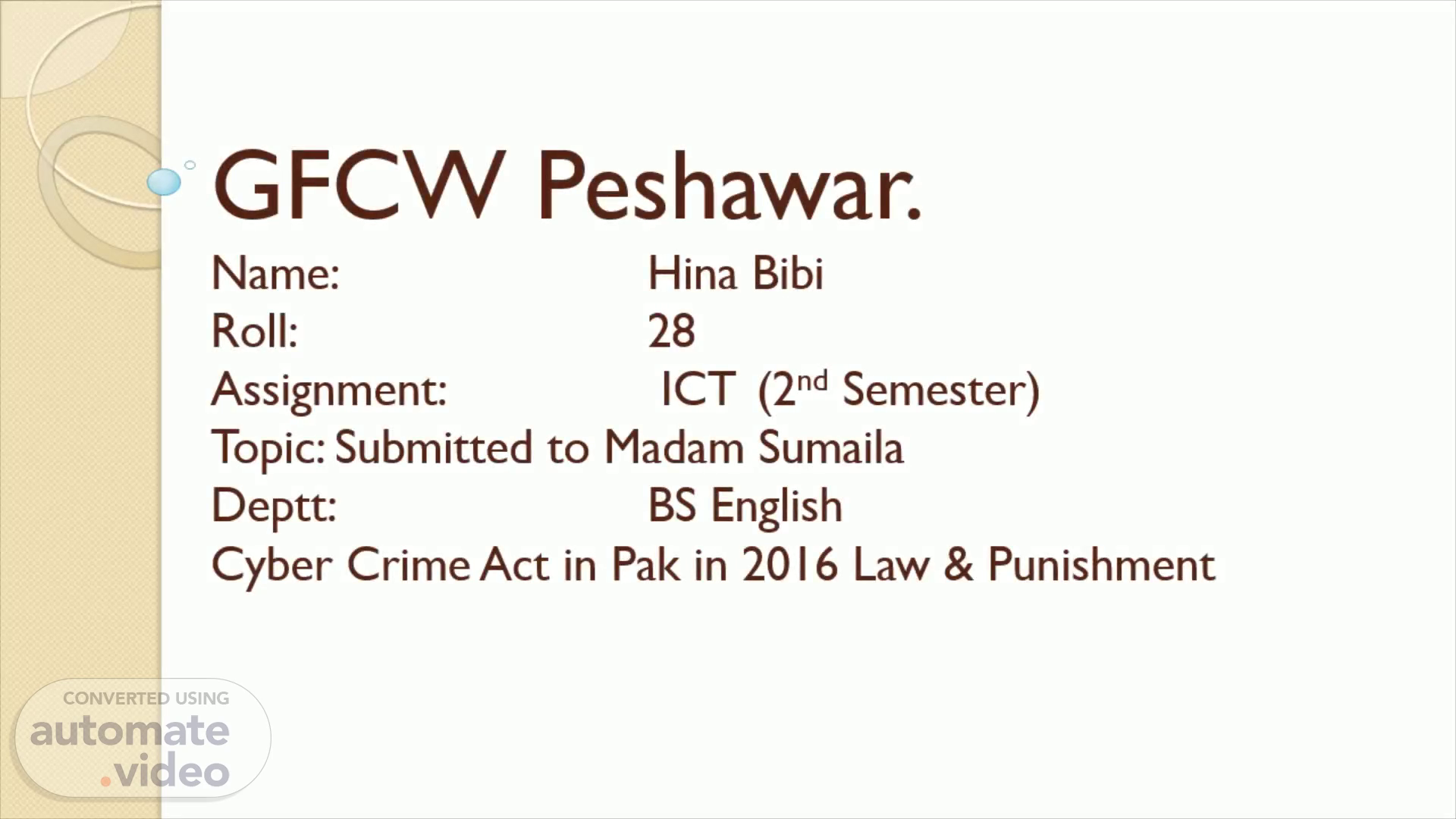 GFCW Peshawar. Name: Hina Bibi Roll: 28 Assignment: ICT (2 nd Semester) Topic: Submitted to Madam Sumaila Deptt : BS English Cyber Crime Act in Pak in 2016 Law & Punishment.