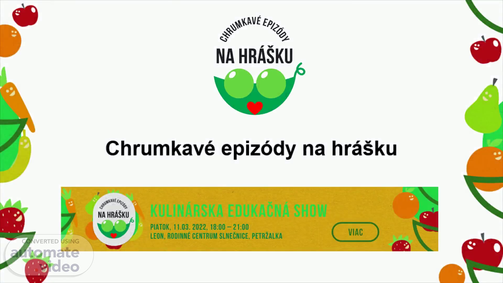 Chrumkavé epizódy na hrášku. Doplnkové informácie: Obraz a zvuk online prenesie a v archíve zachová: Miro Nagy - @livestream_slovakia – https://mlv.sk/blog/ – mediálny partner podujatí Brand a vizuáli pre vaše oko pripravuje: Alena Mazánová CUBE studio – https://cubestudio.sk/ – mediálny partner podujatí: FB @cubestudio.sk.