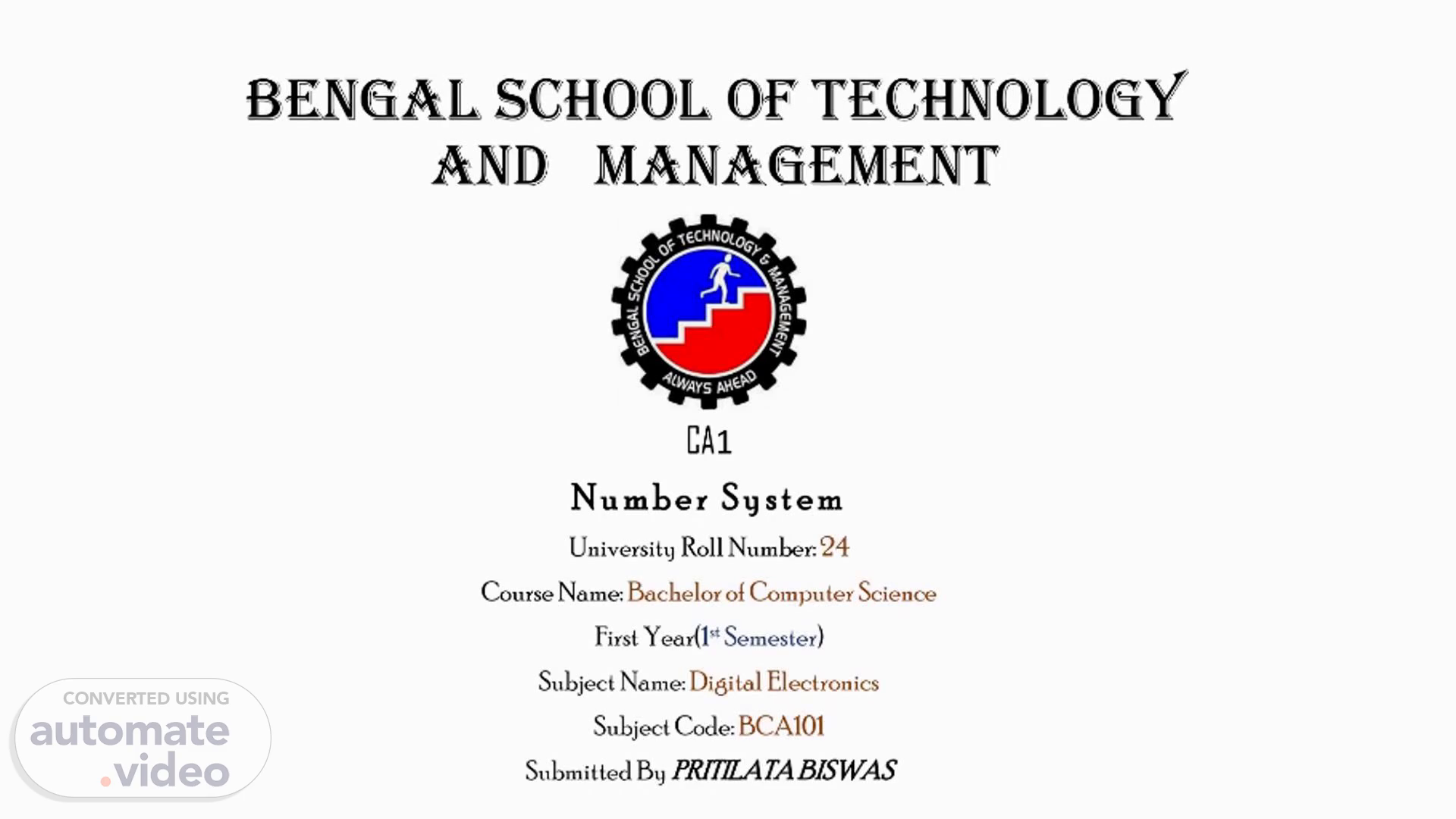 BENGAL SCHOOL OF TECHNOLOGY AND MANAGEMENT CA1 Number System University Roll Number: 24 Course Name: Bachelor of Computer Science First Year(1st Semester) Subject Name: Digital Electronics Subject Code: BCA101 Submitted By PRITILATA BISWAS.