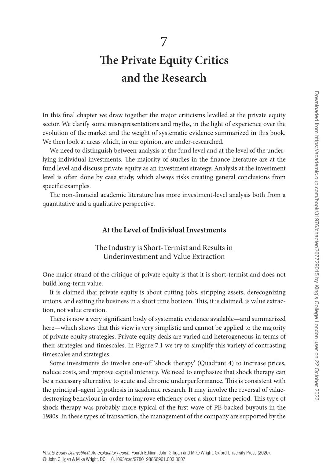 [Audio] Private Equity Demystified: An explanatory guide. Fourth Edition. John Gilligan and Mike Wright, Oxford University Press (2020). © John Gilligan & Mike Wright. DOI: 10.1093/oso/9780198866961.003.0007 7 The Private Equity Critics and the Research In this final chapter we draw together the major criticisms levelled at the private equity sector. We clarify some misrepresentations and myths, in the light of experience over the evolution of the market and the weight of systematic evidence summarized in this book. We then look at areas which, in our opinion, are under-researched. We need to distinguish between analysis at the fund level and at the level of the underlying individual investments. The majority of studies in the finance literature are at the fund level and discuss private equity as an investment strategy. Analysis at the investment level is often done by case study, which always risks creating general conclusions from specific examples. The non-financial academic literature has more investment-level analysis both from a quantitative and a qualitative perspective. At the Level of Individual Investments The Industry is Short-Termist and Results in Underinvestment and Value Extraction One major strand of the critique of private equity is that it is short-termist and does not build long-term value. It is claimed that private equity is about cutting jobs, stripping assets, derecognizing unions, and exiting the business in a short time horizon. This, it is claimed, is value extraction, not value creation. There is now a very significant body of systematic evidence available—and summarized here—which shows that this view is very simplistic and cannot be applied to the majority of private equity strategies. Private equity deals are varied and heterogeneous in terms of their strategies and timescales. In Figure 7.1 we try to simplify this variety of contrasting timescales and strategies. Some investments do involve one-off 'shock therapy' (Quadrant 4) to increase prices, reduce costs, and improve capital intensity. We need to emphasize that shock therapy can be a necessary alternative to acute and chronic underperformance. This is consistent with the principal–agent hypothesis in academic research. It may involve the reversal of valuedestroying behaviour in order to improve efficiency over a short time period. This type of shock therapy was probably more typical of the first wave of PE-backed buyouts in the 1980s. In these types of transaction, the management of the company are supported by the.