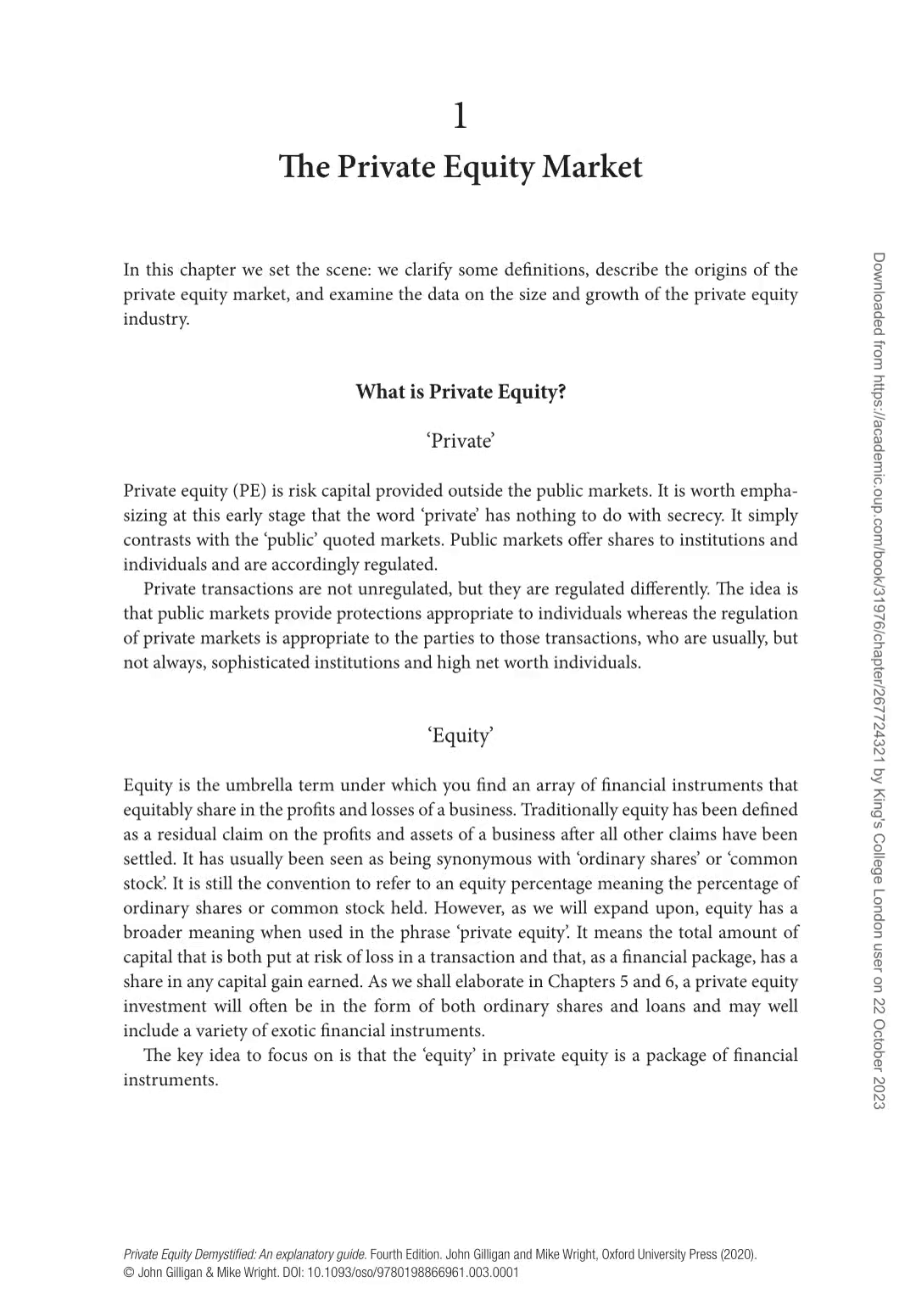 [Audio] Private Equity Demystified: An explanatory guide. Fourth Edition. John Gilligan and Mike Wright, Oxford University Press (2020). © John Gilligan & Mike Wright. DOI: 10.1093/oso/9780198866961.003.0001 1 The Private Equity Market In this chapter we set the scene: we clarify some definitions, describe the origins of the private equity market, and examine the data on the size and growth of the private equity industry. What is Private Equity? 'Private' Private equity (PE) is risk capital provided outside the public markets. It is worth emphasizing at this early stage that the word 'private' has nothing to do with secrecy. It simply contrasts with the 'public' quoted markets. Public markets offer shares to institutions and individuals and are accordingly regulated. Private transactions are not unregulated, but they are regulated differently. The idea is that public markets provide protections appropriate to individuals whereas the regulation of private markets is appropriate to the parties to those transactions, who are usually, but not always, sophisticated institutions and high net worth individuals. 'Equity' Equity is the umbrella term under which you find an array of financial instruments that equitably share in the profits and losses of a business. Traditionally equity has been defined as a residual claim on the profits and assets of a business after all other claims have been settled. It has usually been seen as being synonymous with 'ordinary shares' or 'common stock'. It is still the convention to refer to an equity percentage meaning the percentage of ordinary shares or common stock held. However, as we will expand upon, equity has a broader meaning when used in the phrase 'private equity'. It means the total amount of capital that is both put at risk of loss in a transaction and that, as a financial package, has a share in any capital gain earned. As we shall elaborate in Chapters 5 and 6, a private equity investment will often be in the form of both ordinary shares and loans and may well include a variety of exotic financial instruments. The key idea to focus on is that the 'equity' in private equity is a package of financial instruments..