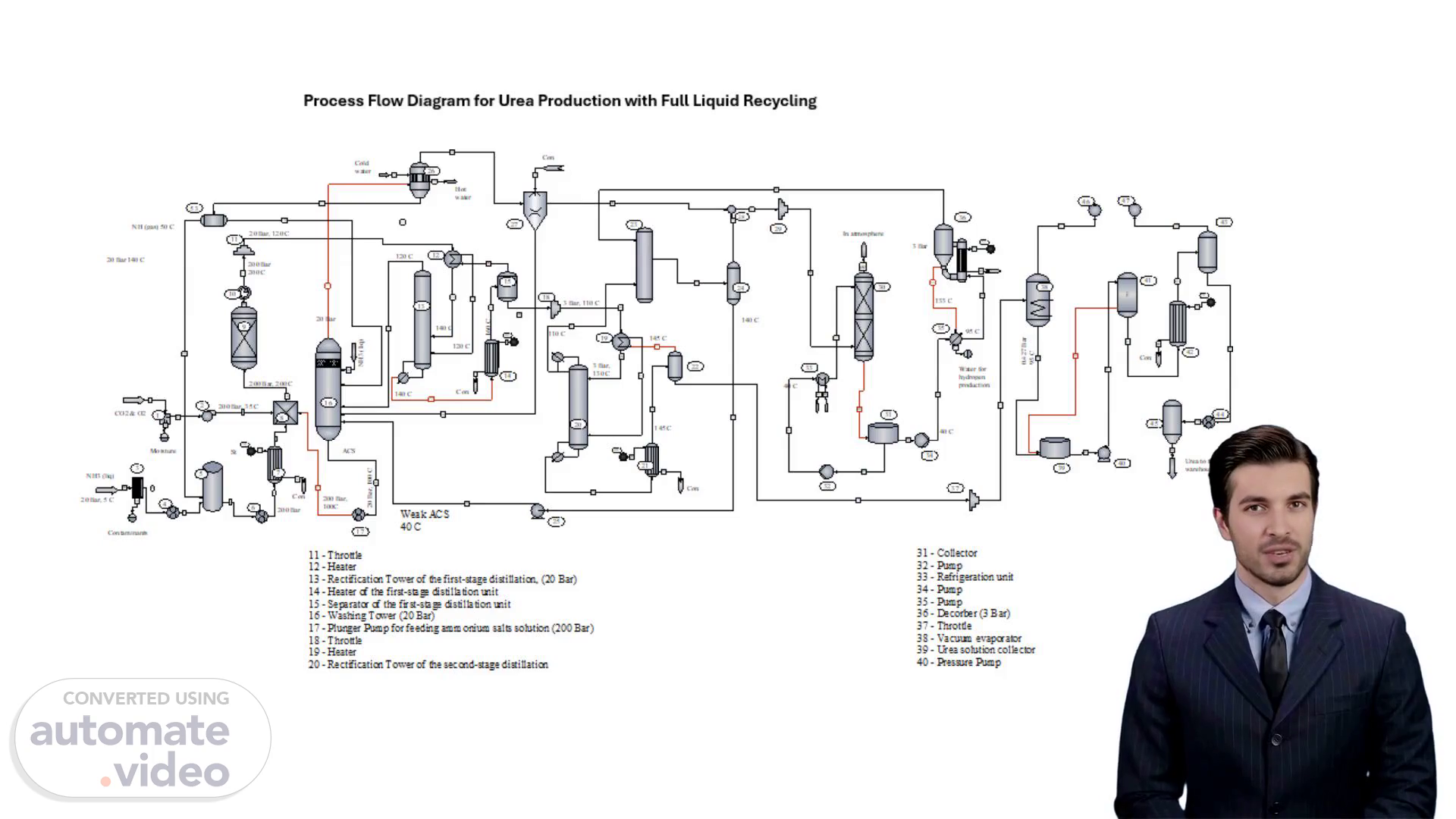 [Virtual Presenter] 1. The production of urea through full liquid recycling is presented. 2. The process involves mixing carbon dioxide with oxygen in an amount of 0.6-1 volume % to prevent corrosion of the apparatus. 3. Liquid ammonia is supplied to the liquid ammonia collector which also receives return liquid ammonia from the condenser. 4. From the collector liquid ammonia is pumped under pressure and temperature to the mixer where it is mixed with carbon dioxide and ammonia not converted into urea in the form of a solution of ammonium salts. 5. The mixer is designed to thoroughly mix all three components resulting in the formation of ammonium carbamate. The process in the mixer takes place at 180-200 degrees celsius and 200 bar. 6. From the mixer the melt enters the synthesis column in which urea is formed at 200 degrees celsius and 200 bar. The residence time (10) of the reaction mixture in the synthesis column is 45 minutes. Under these conditions the degree of conversion of ammonium carbamate to urea is 65%. 7. The urea melt formed in the synthesis column is throttled from 200 bar to 20 bar and sent to the first-stage distillation unit. 8. In the distillation unit the melt is heated to 140 degrees celsius by gases from the separator and the gases are cooled to 120 degrees celsius after transferring their heat to the melt. 9. The liquid phase from the distillation column goes to the heater in which the steam is heated to 160 degrees celsius. From the heater the vapor-liquid mixture enters the separator where the gas and liquid phases are separated. 10. The liquid phase from the separator enters the second-stage distillation unit consisting of a heater a rectification tower and a separator. 11. Pure gaseous ammonia from the washing column is condensed and discharged into the ammonia collector for return to the cycle. 12. The liquid phase after separation is throttled to a pressure of 3 bar and added to the second-stage distillation unit. 13. Finally the liquid phase is a 70-72% urea solution and is sent for processing into the finished product. 14. The process is made possible by the use of C-O-2 as a reactant and oxygen as a passivating agent. 15. The use of full liquid recycling reduces waste and makes the process more efficient..