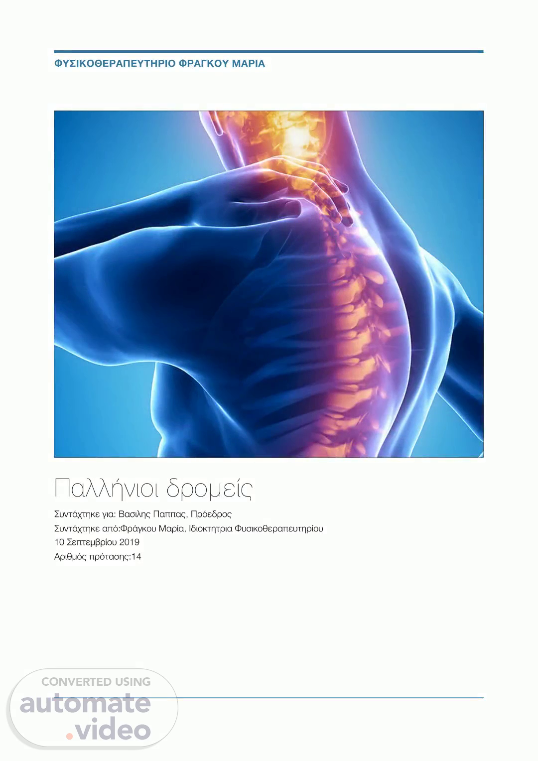 [Audio] Παλλήνιοι δρομείς Συντάχτηκε για: Βασιλης Παππας, Πρόεδρος Συντάχτηκε από:Φράγκου Μαρία, Ιδιοκτητρια Φυσικοθεραπευτηρίου 10 Σεπτεμβρίου 2019 Αριθμός πρότασης:14 ΦΥΣΙΚΟΘΕΡΑΠΕΥΤΗΡΙΟ ΦΡΑΓΚΟΥ ΜΑΡΙΑ.