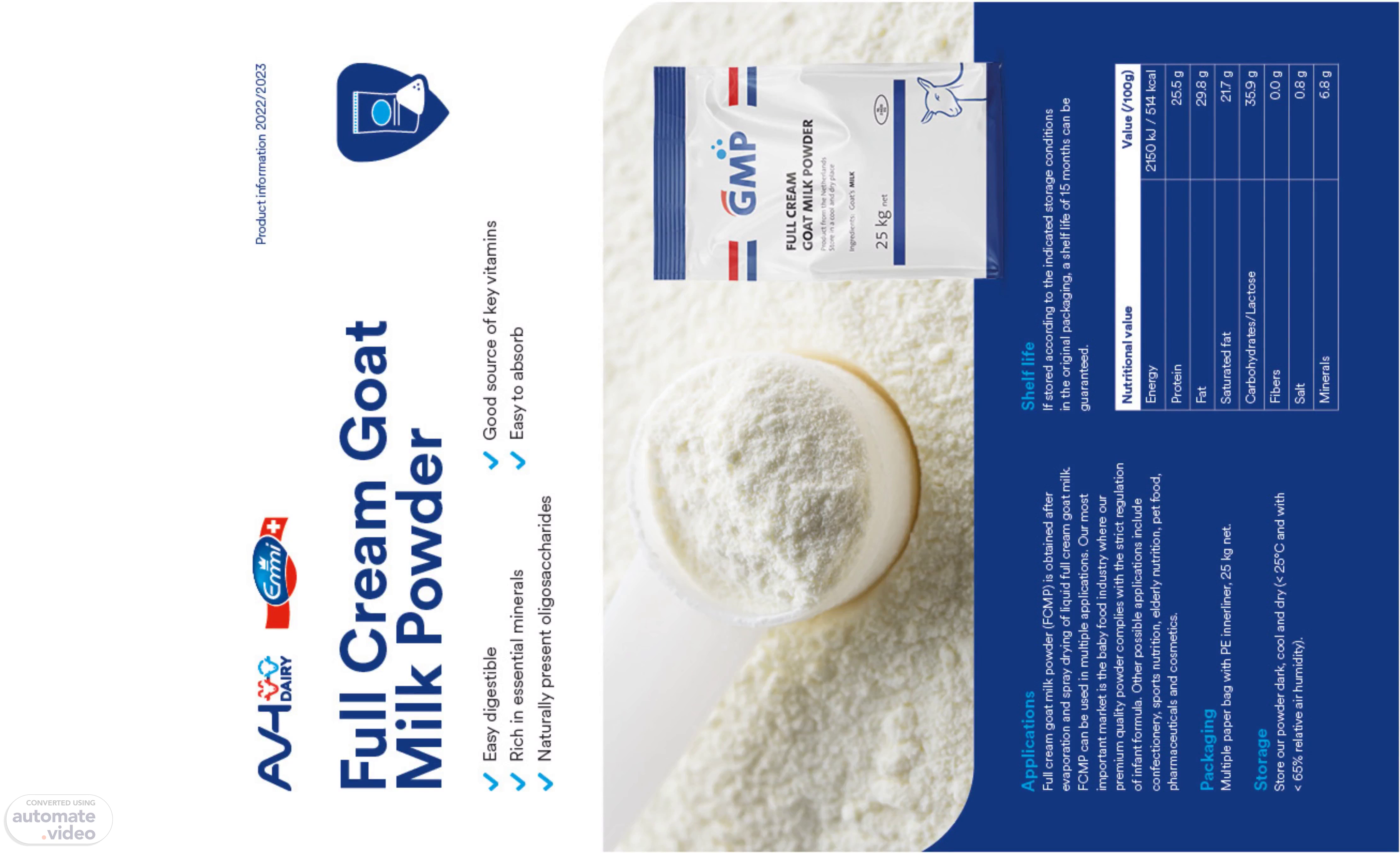 Product info rrnation 2022/2 023 DAIRY Ski rnn•ed Goat M i n k Powder Easy digestible Rich in essential rninerals Applications The first step in the production of skir-nrned goat rnilk is skirnr-ning of the fresh goat r-nilk. After skit-nr-y-ting, vv•ater is fror-n the goat r-nilk through and spray drying, so that skirnrned goat rnilk povv•der rernains. Our rnost ir-nportant rnarket is the baby food industry M.•here our prer-niur-n quality pove•der cornplies •evith the strict regulation of infant forr-nu la. Other poss ible applications include confectionery, sports nutrition. elderly nutrition, pet N aturally present oligosaccharides Good source of key vitarnins G nÄÖ GOAT POVVDER 20 kg Shelf life If stored acc•ording to the indicated storage conditions in the original packaging, a shelf life of 15 rnonths can be food. pha rrnaceuticals and cosrnetics. Pac kag i g paper bag vvith PE innerliner. 20 kg net. Storage Store our povv•der dark, cæl and dry 2500 and < 65% rel ative air hur-nidity). vvith gu a ra r-vteed . Nut ritöor•al valu•e Energy Protei n Saturated fat Carbohyd ra tes/ Lactose Fi bers Salt inera I s value 1510 kJ / 361 kcal 36.2 1.0 50.0 0.0 g 0.9 g 9.5 g.