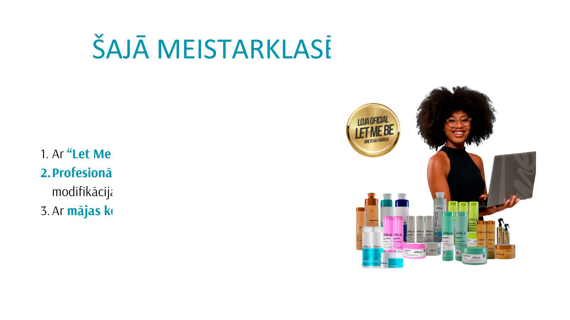 ŠAJĀ MEISTARKLASĒ IEPAZĪSIES:. Ar “Let Me Be” zīmolu Profesionālajiem matu rekonstrukcijas un modifikācijas sastāviem Ar mājas kopšanu pēc procedūras.