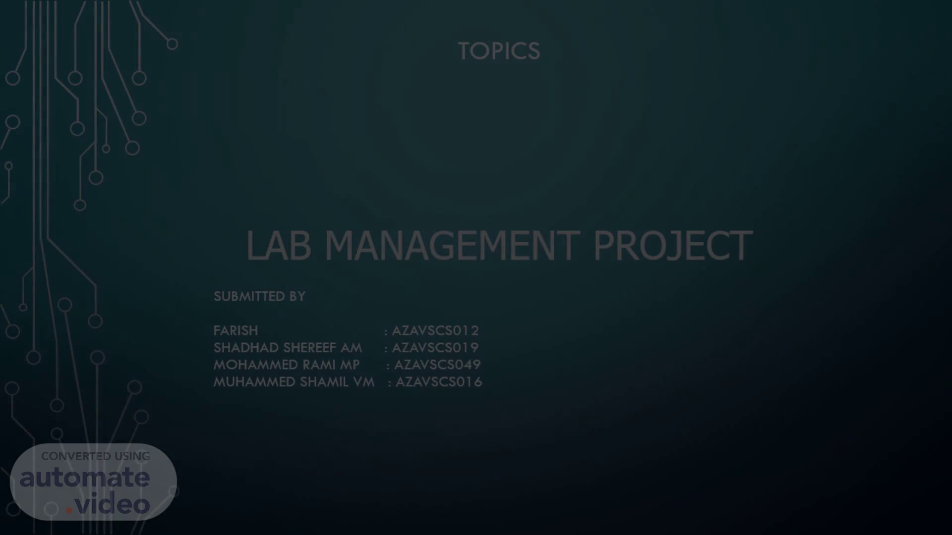 [Audio] TOPICS LAB MANAGEMENT PROJECT SUBMITTED BY FARISH : AZAVSCS012 SHADHAD SHEREEF AM : AZAVSCS019 MOHAMMED RAMI MP : AZAVSCS049 MUHAMMED SHAMIL VM : AZAVSCS016.