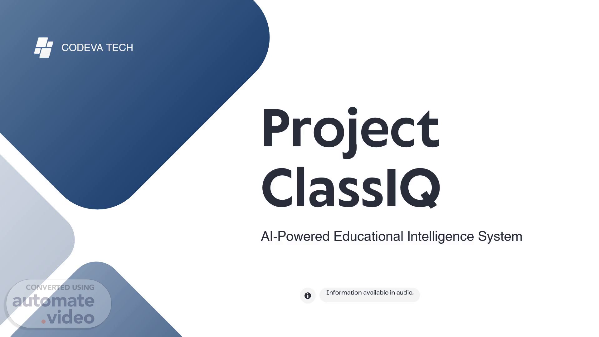 [Audio] Good morning everyone, welcome to today's presentation about the ClassIQ project by Codeva Tech. We are thrilled to introduce our cutting-edge educational intelligence system powered by AI that will transform how teachers utilize data to make informed choices. With this system, teachers will have access to real-time insights, predictions, and recommendations that will improve student learning and academic achievement. We are eager to demonstrate the potential impact of ClassIQ in the field of education. Let's get started!.