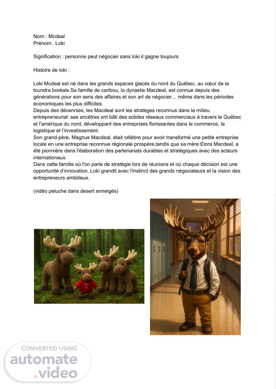 [Audio] Nom : Mcdeal Prénom: Loki Signification : personne peut négocier sans loki il gagne toujours Histoire de loki : Loki Mcdeal est né dans les grands espaces glacés du nord du Québec, au cœur de la toundra boréale.Sa famille de caribou, la dynastie Macdeal, est connue depuis des générations pour son sens des affaires et son art de négocier… même dans les périodes économiques les plus difficiles. Depuis des décennies, les Macdeal sont les stratèges reconnus dans le milieu entrepreneurial: ses ancêtres ont bâti des solides réseaux commerciaux à travers le Québec et l'amérique du nord, développant des entreprises florissantes dans le commerce, la logistique et l'investissement. Son grand-père, Magnus Macdeal, était célèbre pour avoir transformé une petite entreprise locale en une entreprise reconnue régionale prospère,tandis que sa mère Elora Macdeal, a été pionnière dans l'élaboration des partenariats durables et stratégiques avec des acteurs internationaux. Dans cette famille où l'on parle de stratégie lors de réunions et où chaque décision est une opportunité d'innovation, Loki grandit avec l'instinct des grands négociateurs et la vision des entrepreneurs ambitieux. (vidéo peluche dans desert enneigés).