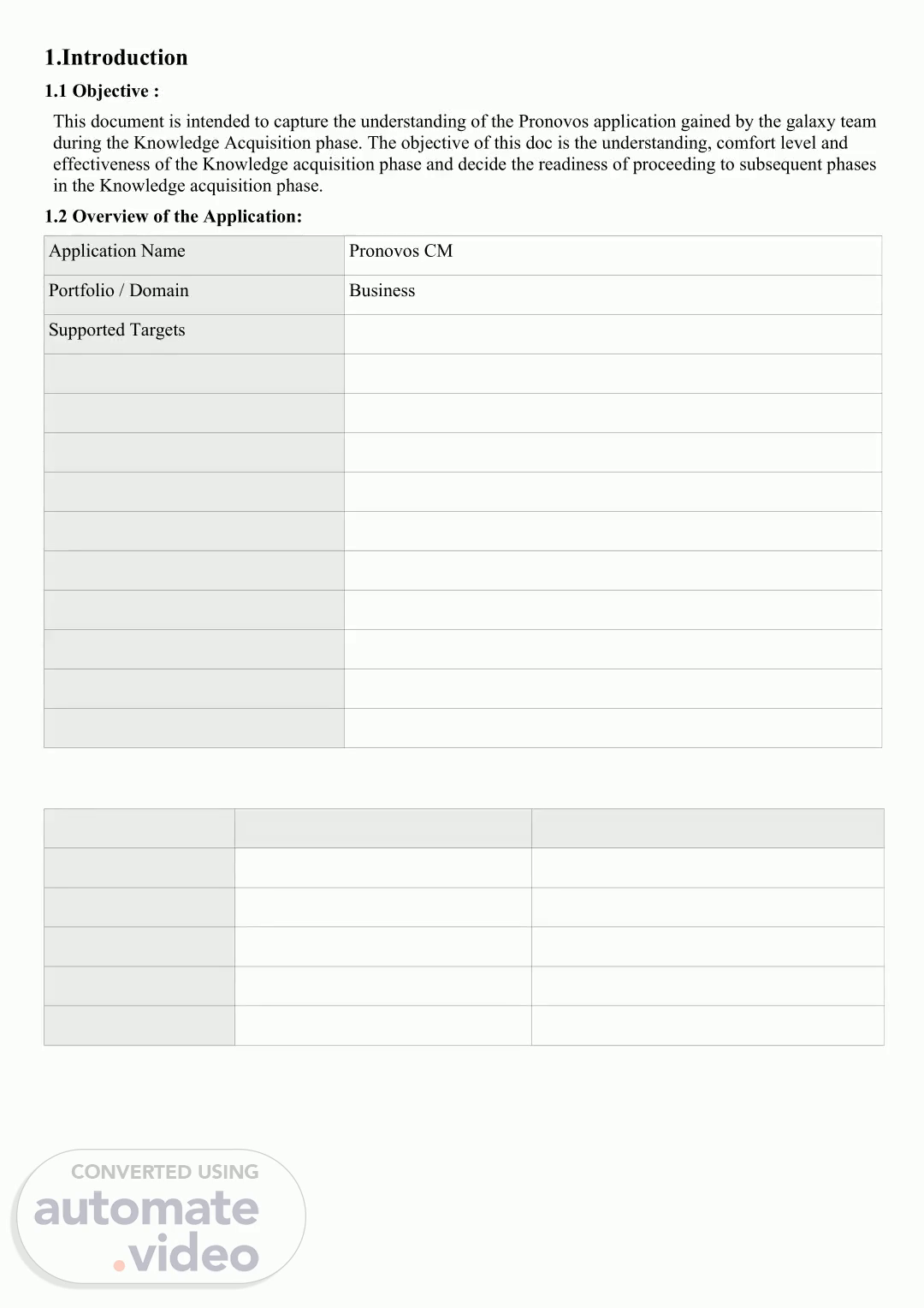 . . 1.Introduction. 1.1 Objective :. This document is intended to capture the understanding of the Pronovos application gained by the galaxy team during the Knowledge Acquisition phase. The objective of this doc is the understanding, comfort level and effectiveness of the Knowledge acquisition phase and decide the readiness of proceeding to subsequent phases in the Knowledge acquisition phase..