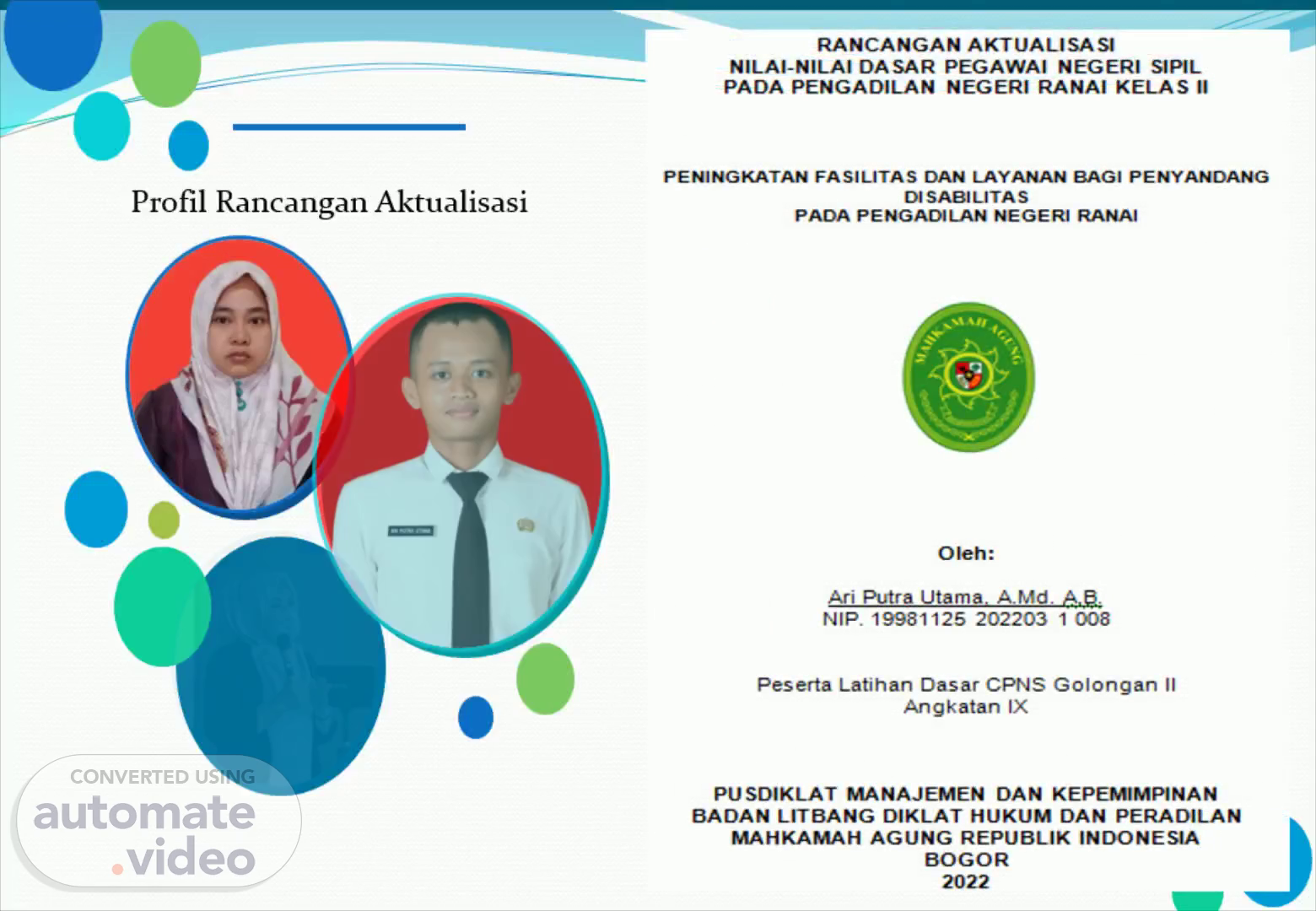 RANCANGAN AKTUALISASI NILAI-NILAI DASAR PEGAWAI NEGERI SIPIL PADA PENGADILAN NEGERI RANAI KELAS 11 PENINGKATAN FASILITAS DAN LAYANAN BAGI PENYANOANG DISABILITAS PADA PENGAOILAN NEGERI RANAI Oleh: Ari Putra Utama. A. Md. NIP. 19981125 202203 1 C08 Peserta Latihan Dasar CPNS Golongan II Angkatan IX PUSDIKLAT MANAJEMEN DAN KEPEMIMPINAN BADAN LITBANG DIKLAT HOKUM DAN PERADILAN MAHKAMAH AGUNG REPUBLIK INDONESIA BOGOR 2022.