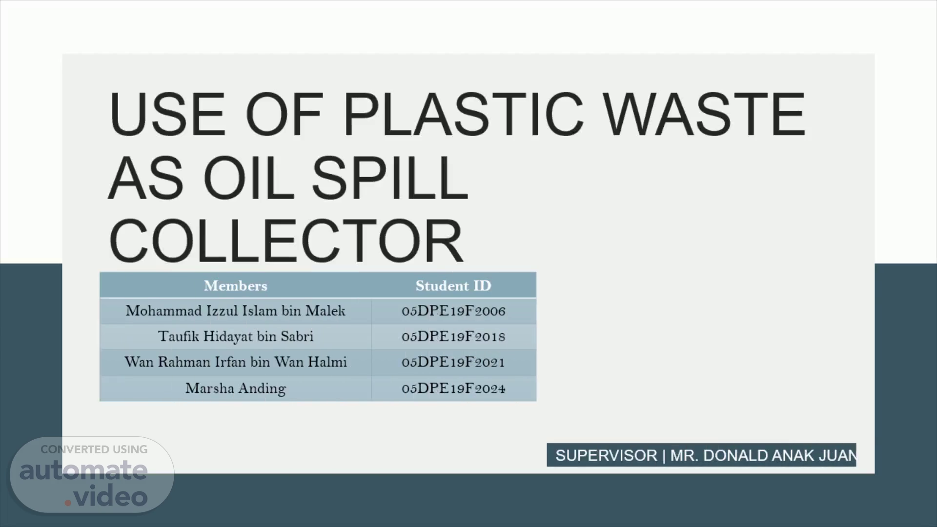 USE OF PLASTIC WASTE AS OIL SPILL COLLECTOR. SUPERVISOR | MR. DONALD ANAK JUAN.