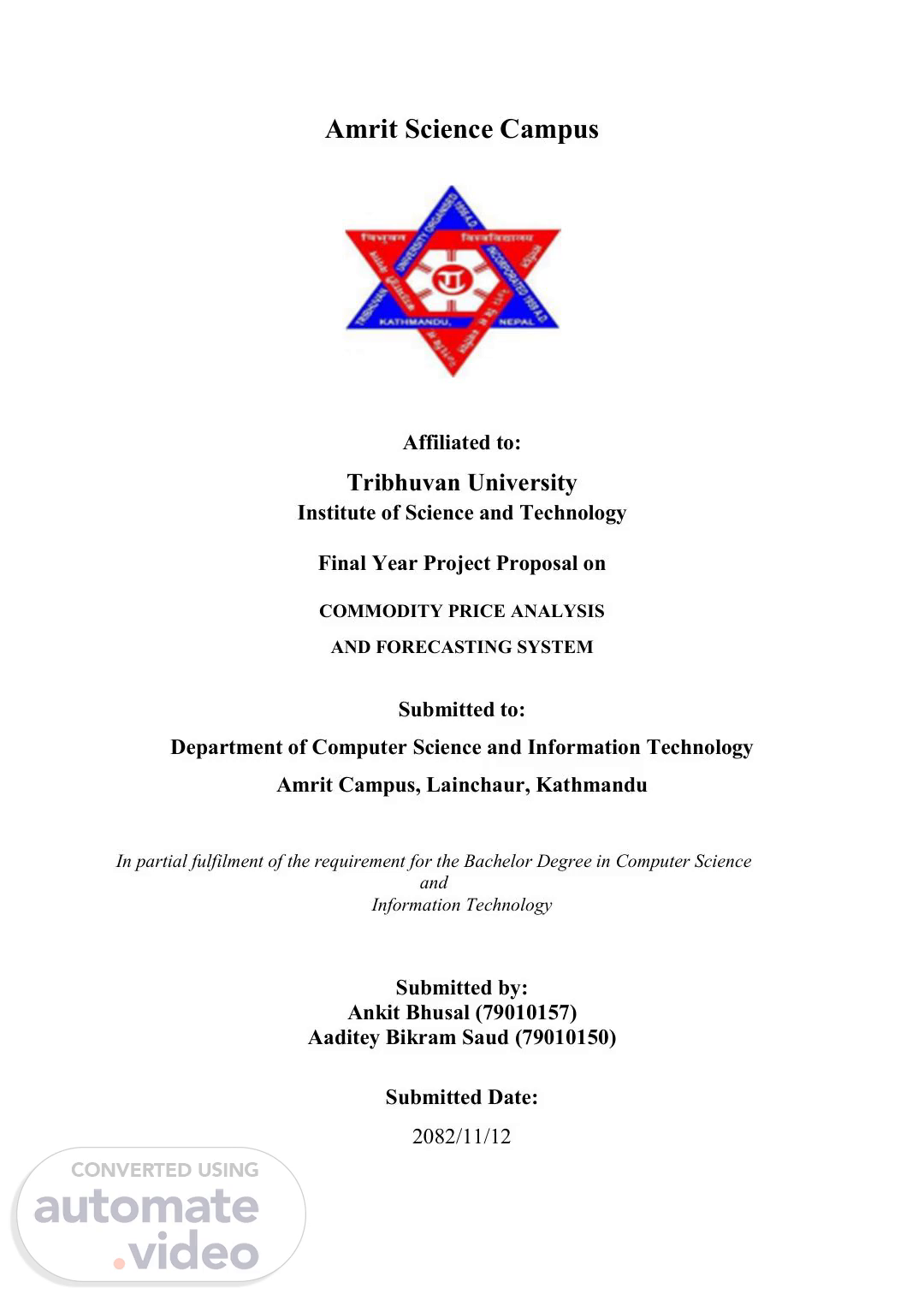 Amrit Science Campus Affiliated to: Tribhuvan University Institute of Science and Technology Final Year Project Proposal on COMMODITY PRICE ANALYSIS AND FORECASTING SYSTEM Submitted to: Department of Computer Science and Information Technology Amrit Campus, Lainchaur, Kathmandu In partial fulfilment of the requirement for the Bachelor Degree in Computer Science and Information Technology Submitted by: Ankit Bhusal (79010157) Aaditey Bikram Saud (79010150) Submitted Date: 2082/11/12.