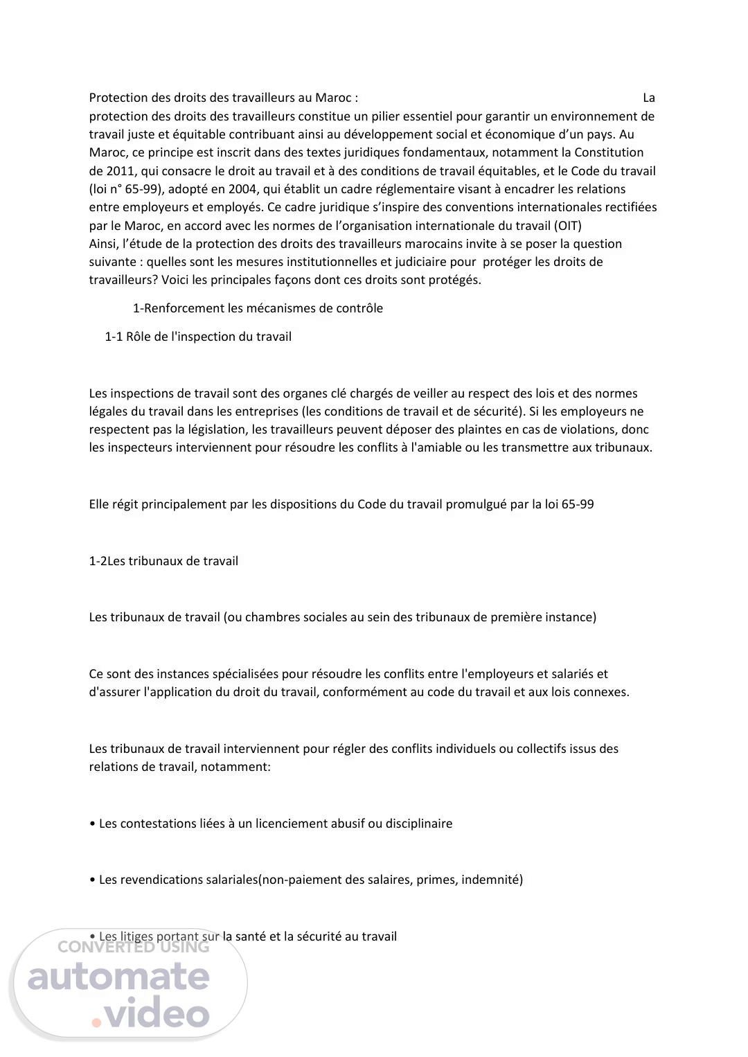 Protection des droits des travailleurs au Maroc : La protection des droits des travailleurs constitue un pilier essentiel pour garantir un environnement de travail juste et équitable contribuant ainsi au développement social et économique d’un pays. Au Maroc, ce principe est inscrit dans des textes juridiques fondamentaux, notamment la Constitution de 2011, qui consacre le droit au travail et à des conditions de travail équitables, et le Code du travail (loi n° 65-99), adopté en 2004, qui établit un cadre réglementaire visant à encadrer les relations entre employeurs et employés. Ce cadre juridique s’inspire des conventions internationales rectifiées par le Maroc, en accord avec les normes de l’organisation internationale du travail (OIT) Ainsi, l’étude de la protection des droits des travailleurs marocains invite à se poser la question suivante : quelles sont les mesures institutionnelles et judiciaire pour protéger les droits de travailleurs? Voici les principales façons dont ces droits sont protégés. 1-Renforcement les mécanismes de contrôle 1-1 Rôle de l'inspection du travail Les inspections de travail sont des organes clé chargés de veiller au respect des lois et des normes légales du travail dans les entreprises (les conditions de travail et de sécurité). Si les employeurs ne respectent pas la législation, les travailleurs peuvent déposer des plaintes en cas de violations, donc les inspecteurs interviennent pour résoudre les conflits à l'amiable ou les transmettre aux tribunaux. Elle régit principalement par les dispositions du Code du travail promulgué par la loi 65-99 1-2Les tribunaux de travail Les tribunaux de travail (ou chambres sociales au sein des tribunaux de première instance) Ce sont des instances spécialisées pour résoudre les conflits entre l'employeurs et salariés et d'assurer l'application du droit du travail, conformément au code du travail et aux lois connexes. Les tribunaux de travail interviennent pour régler des conflits individuels ou collectifs issus des relations de travail, notamment: • Les contestations liées à un licenciement abusif ou disciplinaire • Les revendications salariales(non-paiement des salaires, primes, indemnité) • Les litiges portant sur la santé et la sécurité au travail.