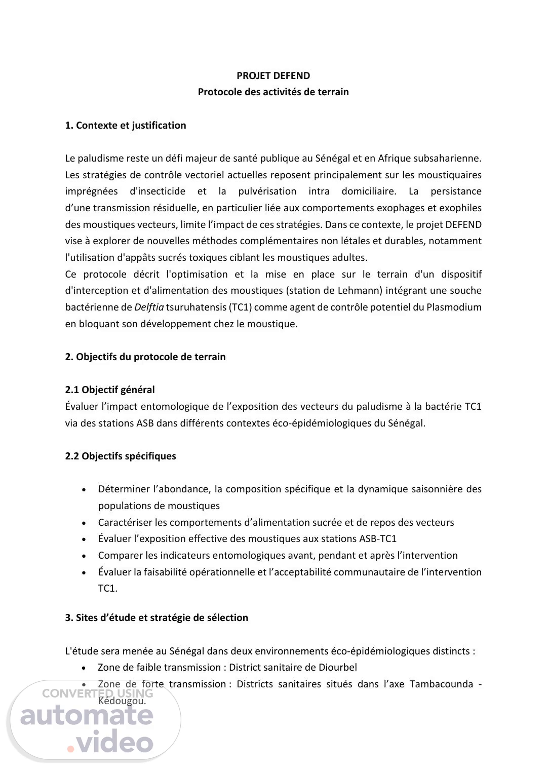 PROJET DEFEND Protocole des activités de terrain 1. Contexte et justification Le paludisme reste un défi majeur de santé publique au Sénégal et en Afrique subsaharienne. Les stratégies de contrôle vectoriel actuelles reposent principalement sur les moustiquaires imprégnées d'insecticide et la pulvérisation intra domiciliaire. La persistance d’une transmission résiduelle, en particulier liée aux comportements exophages et exophiles des moustiques vecteurs, limite l’impact de ces stratégies. Dans ce contexte, le projet DEFEND vise à explorer de nouvelles méthodes complémentaires non létales et durables, notamment l'utilisation d'appâts sucrés toxiques ciblant les moustiques adultes. Ce protocole décrit l'optimisation et la mise en place sur le terrain d'un dispositif d'interception et d'alimentation des moustiques (station de Lehmann) intégrant une souche bactérienne de Delftia tsuruhatensis (TC1) comme agent de contrôle potentiel du Plasmodium en bloquant son développement chez le moustique. 2. Objectifs du protocole de terrain 2.1 Objectif général Évaluer l’impact entomologique de l’exposition des vecteurs du paludisme à la bactérie TC1 via des stations ASB dans différents contextes éco-épidémiologiques du Sénégal. 2.2 Objectifs spécifiques • Déterminer l’abondance, la composition spécifique et la dynamique saisonnière des populations de moustiques • Caractériser les comportements d’alimentation sucrée et de repos des vecteurs • Évaluer l’exposition effective des moustiques aux stations ASB-TC1 • Comparer les indicateurs entomologiques avant, pendant et après l’intervention • Évaluer la faisabilité opérationnelle et l’acceptabilité communautaire de l’intervention TC1. 3. Sites d’étude et stratégie de sélection L'étude sera menée au Sénégal dans deux environnements éco-épidémiologiques distincts : • Zone de faible transmission : District sanitaire de Diourbel • Zone de forte transmission : Districts sanitaires situés dans l’axe Tambacounda - Kédougou..