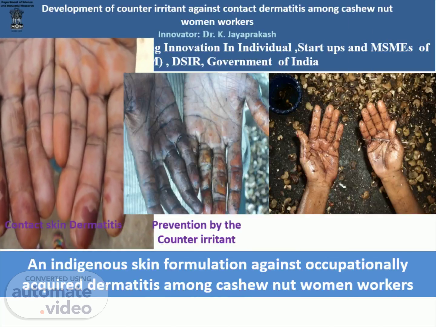 Development of counter irritant against contact dermatitis among cashew nut women workers Innovator: Dr. K. Jayaprakash Supporting Under Promoting Innovation In Individual ,Start ups and MSMEs of (PRISM) , DSIR, Government of India.