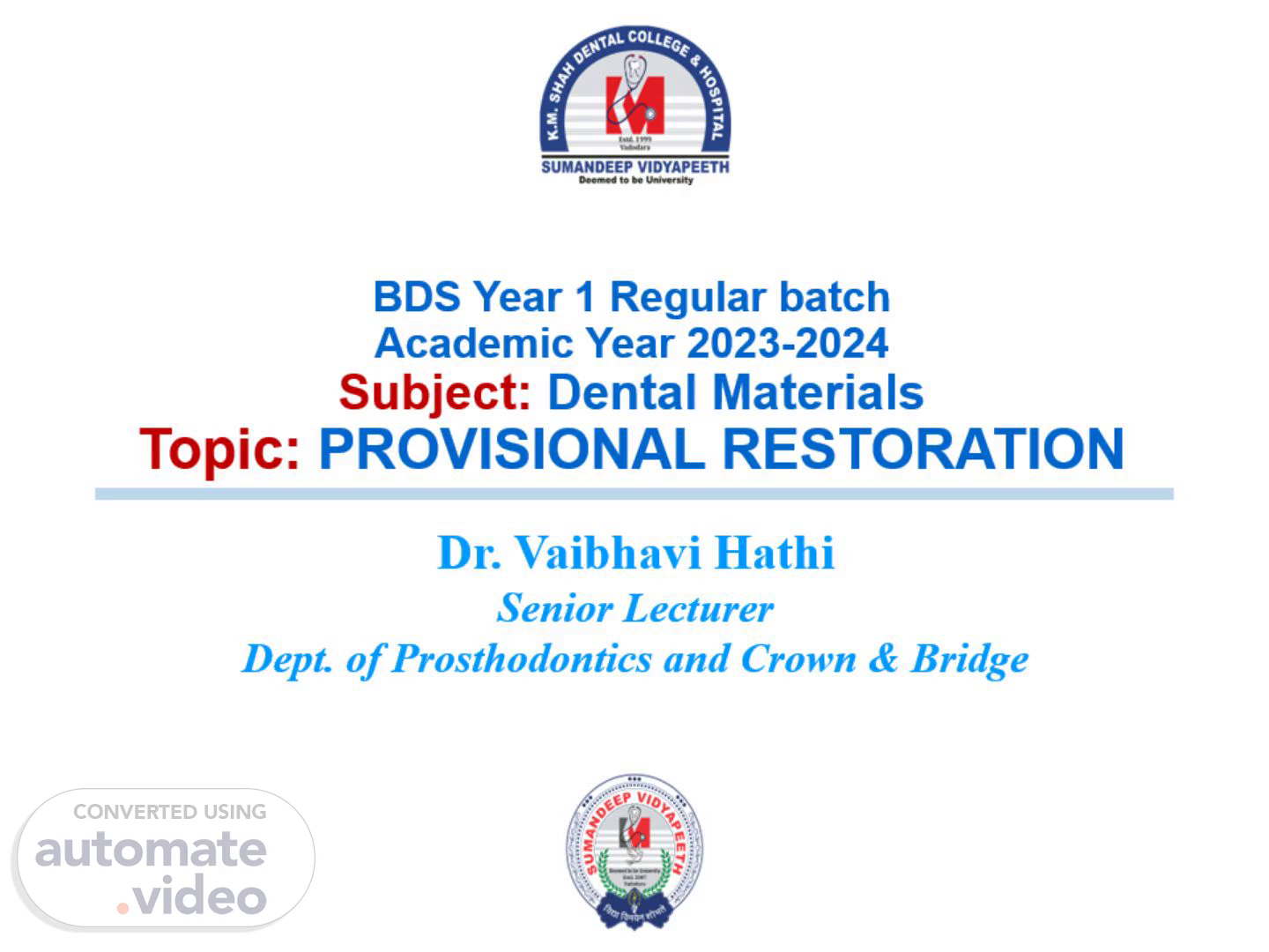 [Audio] BDS Year 1 Regular batch Academic Year 2023-2024 Subject: Dental Materials Topic: PROVISIONAL RESTORATION Dr. Vaibhavi Hathi Senior Lecturer Dept. of Prosthodontics and Crown & Bridge.