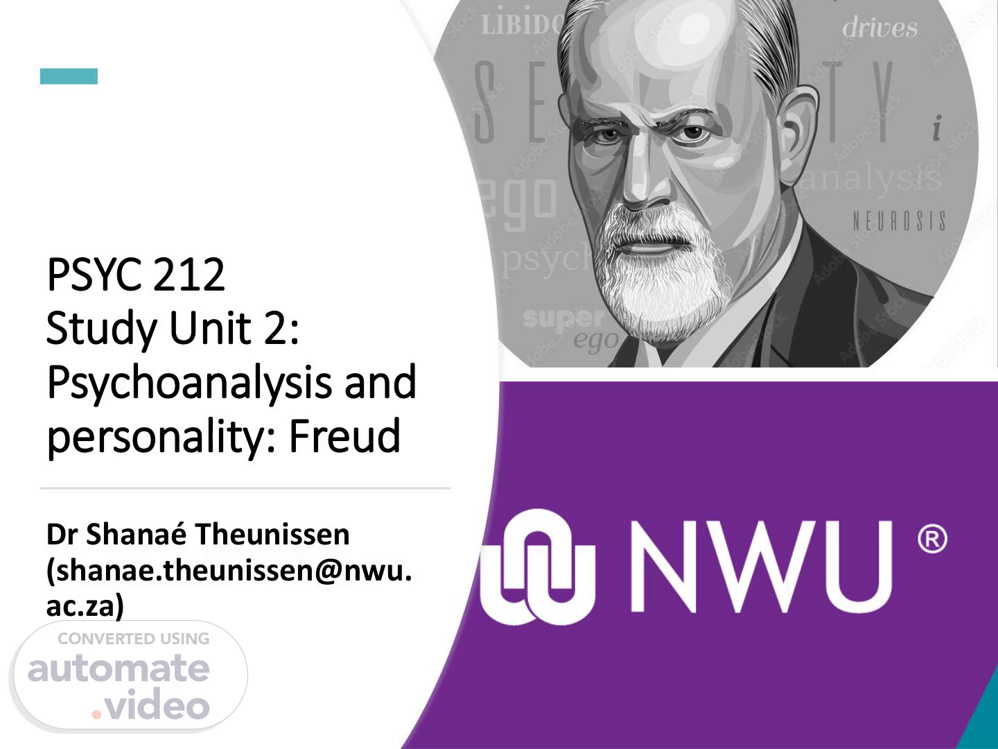 PSYC 212 Study Unit 2: Psychoanalysis and personality: Freud Dr Shanaé Theunissen (shanae.theunissen@nwu. ac.za).
