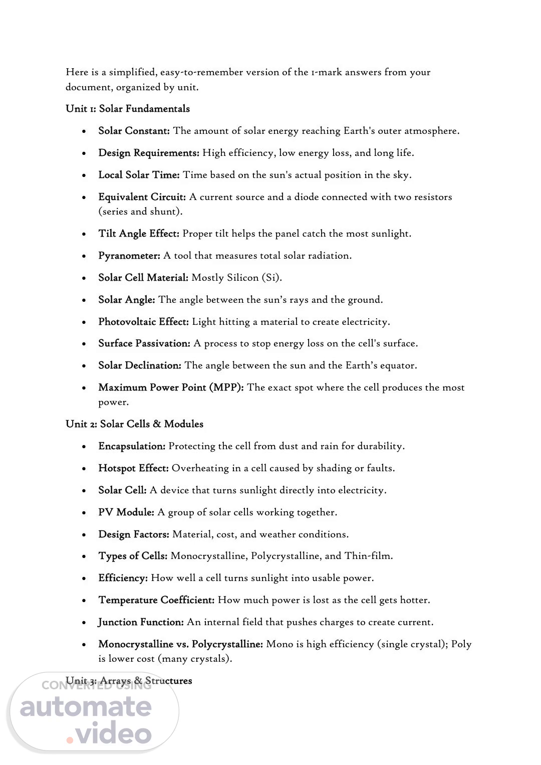 Here is a simplified, easy-to-remember version of the 1-mark answers from your document, organized by unit. Unit 1: Solar Fundamentals • Solar Constant: The amount of solar energy reaching Earth's outer atmosphere. • Design Requirements: High efficiency, low energy loss, and long life. • Local Solar Time: Time based on the sun's actual position in the sky. • Equivalent Circuit: A current source and a diode connected with two resistors (series and shunt). • Tilt Angle Effect: Proper tilt helps the panel catch the most sunlight. • Pyranometer: A tool that measures total solar radiation. • Solar Cell Material: Mostly Silicon (Si). • Solar Angle: The angle between the sun’s rays and the ground. • Photovoltaic Effect: Light hitting a material to create electricity. • Surface Passivation: A process to stop energy loss on the cell's surface. • Solar Declination: The angle between the sun and the Earth’s equator. • Maximum Power Point (MPP): The exact spot where the cell produces the most power. Unit 2: Solar Cells & Modules • Encapsulation: Protecting the cell from dust and rain for durability. • Hotspot Effect: Overheating in a cell caused by shading or faults. • Solar Cell: A device that turns sunlight directly into electricity. • PV Module: A group of solar cells working together. • Design Factors: Material, cost, and weather conditions. • Types of Cells: Monocrystalline, Polycrystalline, and Thin-film. • Efficiency: How well a cell turns sunlight into usable power. • Temperature Coefficient: How much power is lost as the cell gets hotter. • Junction Function: An internal field that pushes charges to create current. • Monocrystalline vs. Polycrystalline: Mono is high efficiency (single crystal); Poly is lower cost (many crystals). Unit 3: Arrays & Structures.