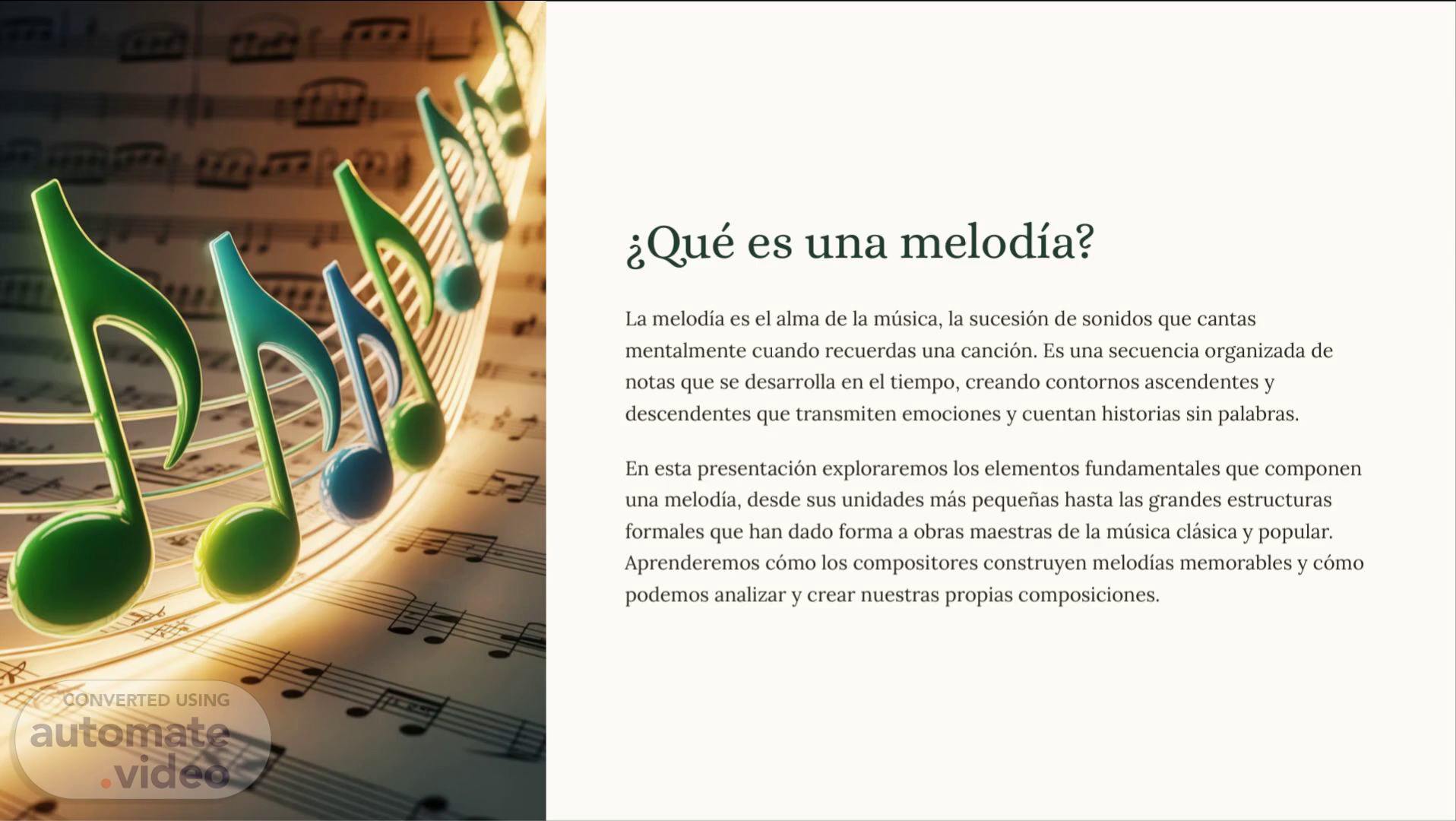 [Virtual Presenter] ¿Qué es una melodía? La melodía es el alma de la música, la sucesión de sonidos que cantas mentalmente cuando recuerdas una canción. Es una secuencia organizada de notas que se desarrolla en el tiempo, creando contornos ascendentes y descendentes que transmiten emociones y cuentan historias sin palabras. En esta presentación exploraremos los elementos fundamentales que componen una melodía, desde sus unidades más pequeñas hasta las grandes estructuras formales que han dado forma a obras maestras de la música clásica y popular. Aprenderemos cómo los compositores construyen melodías memorables y cómo podemos analizar y crear nuestras propias composiciones..