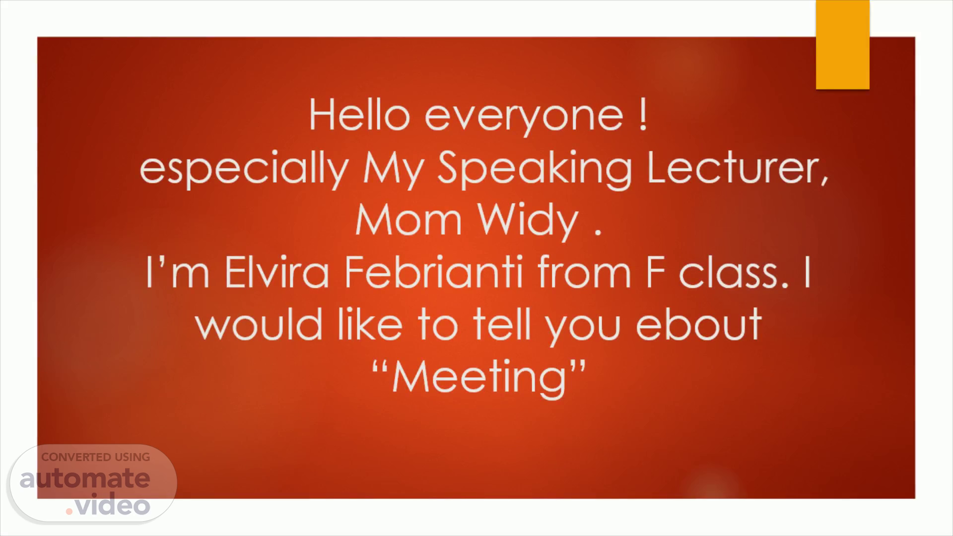 Hello everyone ! especially My Speaking Lecturer, Mom Widy . I'm Elvira Febrianti from F class. I would like to tell you ebout "Meeting"