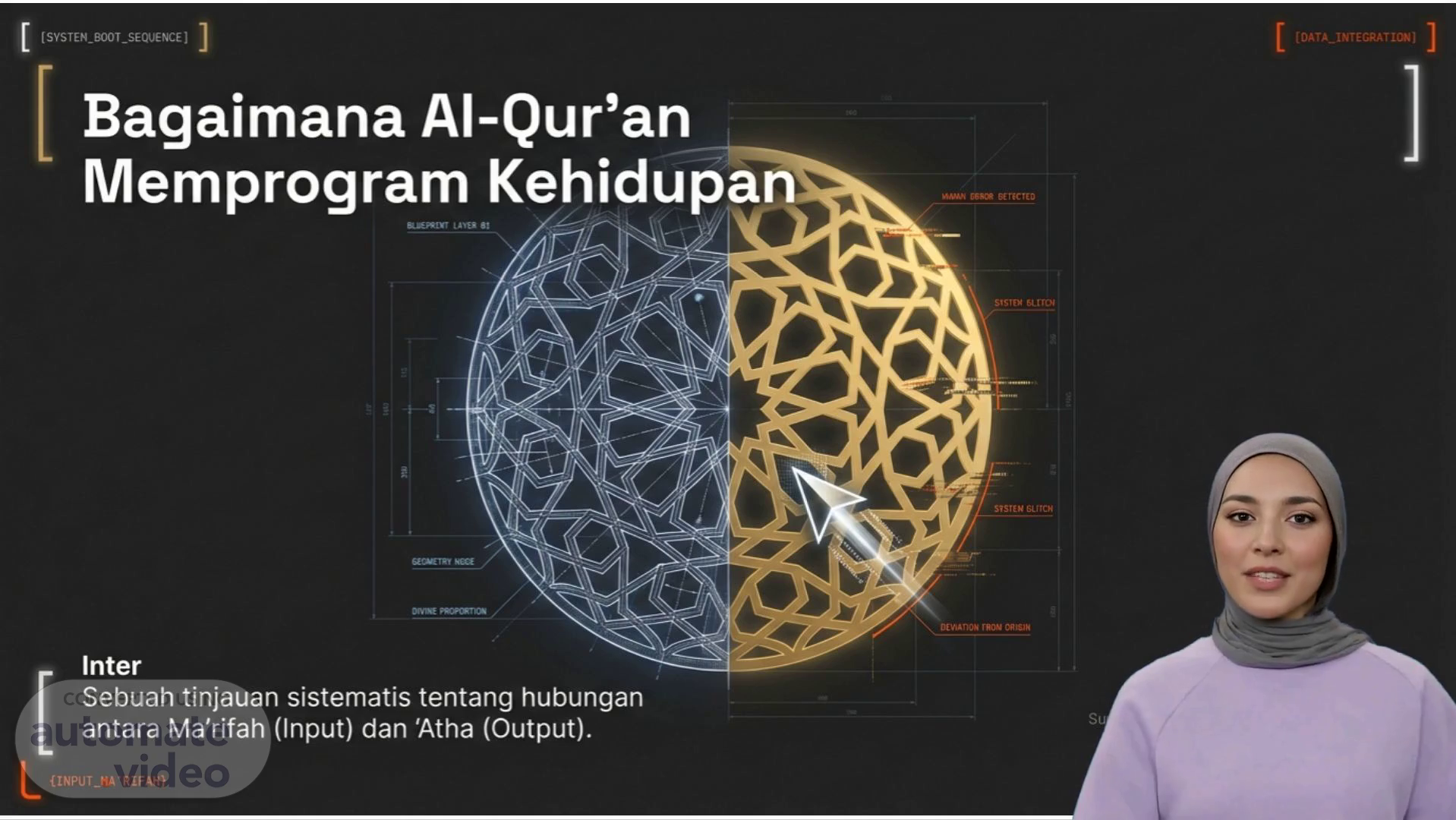 [Virtual Presenter] Selamat pagi! Selamat datang di pelatihan yang membahas tentang Bagaimana A1-Qur'an Memprogram Kehidupan. Pada presentasi kali ini, kita akan membahas tentang Divine Proportion dan hubungannya dengan Ma'rifah dan 'Atha. Kita akan melihat secara sistematis bagaimana Ma'rifah sebagai input mempengaruhi 'Atha sebagai output dalam kehidupan kita. Kami juga akan memperkenalkan sistem SELECTED dan sistem data integration, serta menjelaskan tentang JetBrains Hono. Materi ini didasarkan pada penelitian Kaifa Yubarmijjul Qur'anul Rayah dan disajikan oleh Ngajl Bareng Media. Tanpa banyak basa-basi, mari kita mulai..