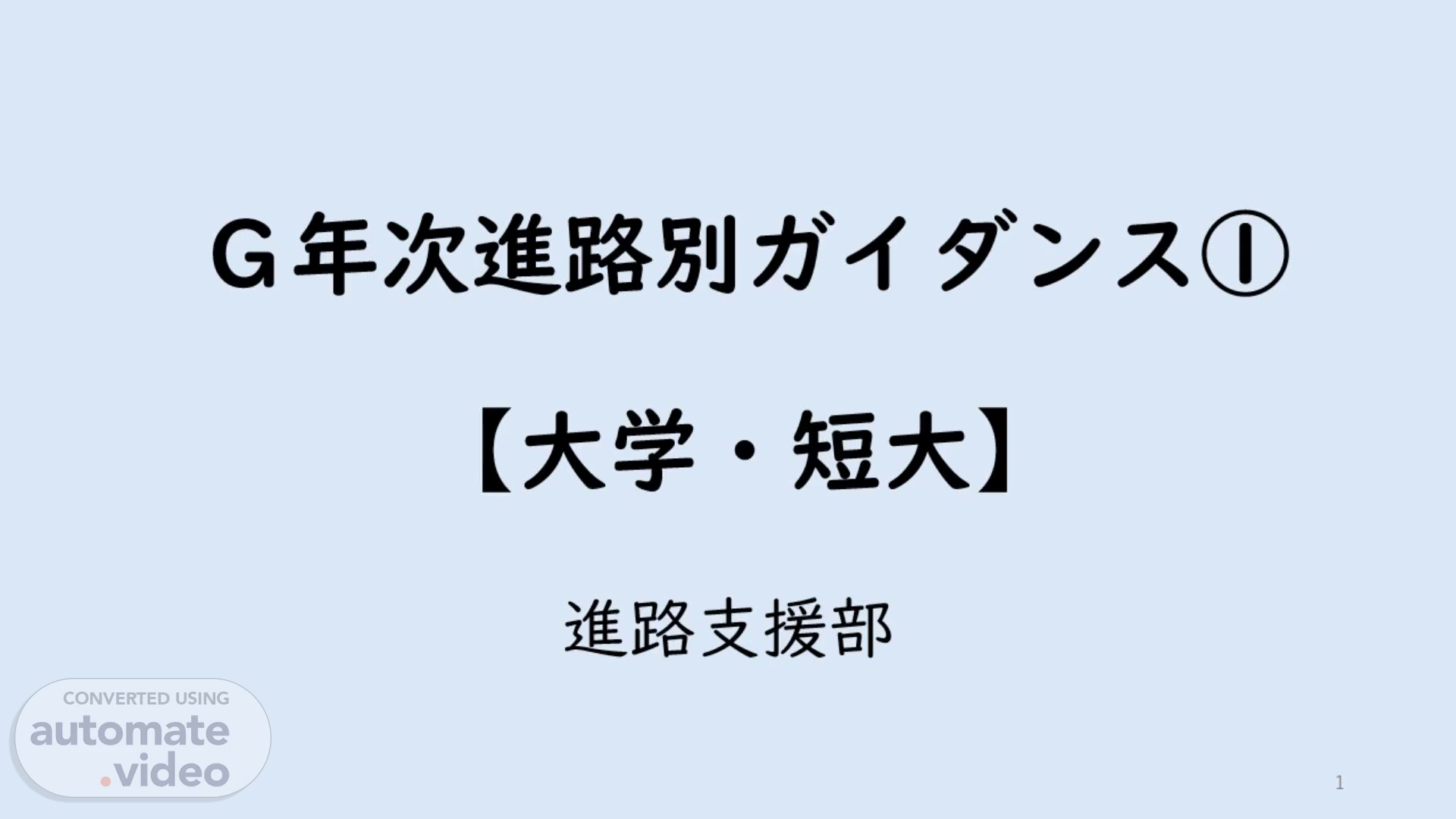 [Audio] 皆さん、こんにちは。進路支援部です。今回は「G年次 進路別ガイダンス」として、大学・短大、専門学校、そして就職というそれぞれの道についてお話しします。皆さんの「未来」を一緒に考える時間にしましょう。 まずは大学・短大について学び、その後に専門学校、就職についても学んでいきます。.