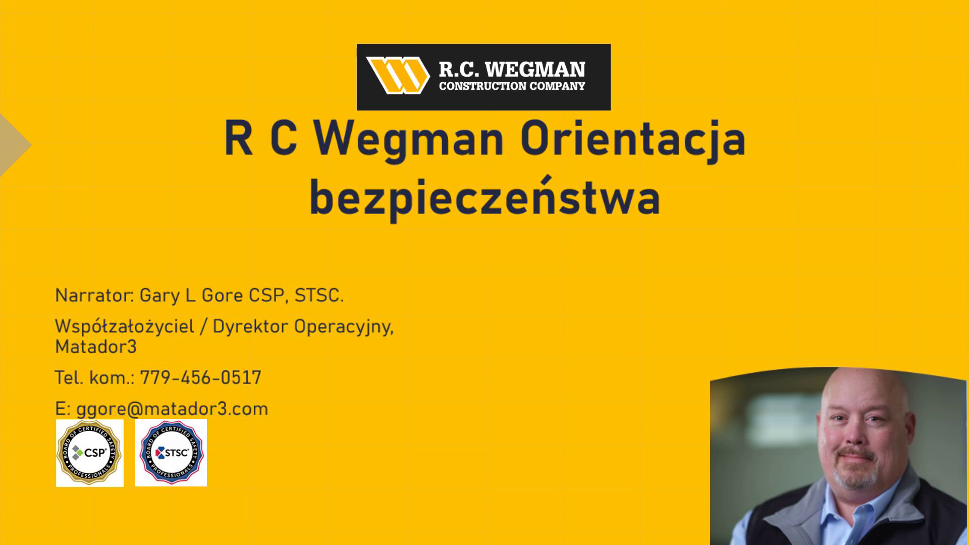 [Audio] R C Wegman Orientacja bezpieczeństwa Narrator: Gary L Gore CSP, STSC. Współzałożyciel / Dyrektor Operacyjny, Matador3 Tel. kom.: 779-456-0517 E: [email protected].