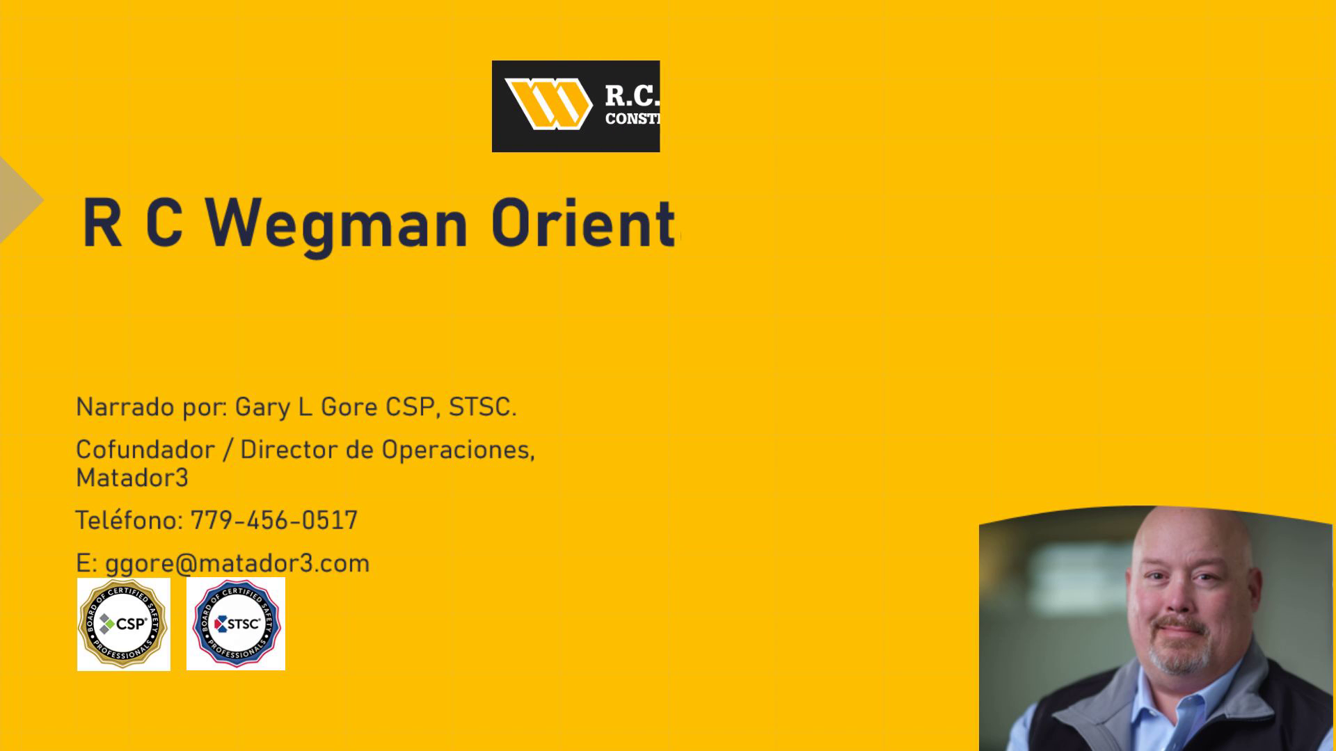 R C Wegman Orientación de seguridad. Narrado por: Gary L Gore CSP, STSC. Cofundador / Director de Operaciones, Matador3 Teléfono: 779-456-0517 E: [email protected].