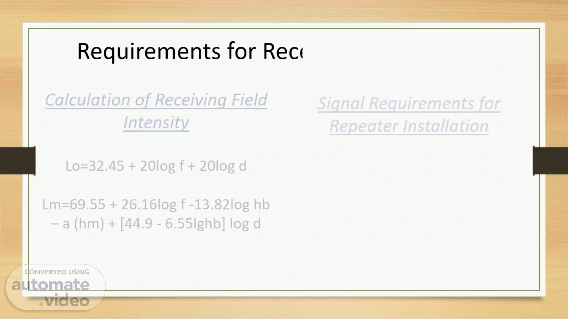 Requirements for Receiving Signal Level. Calculation of Receiving Field Intensity Lo=32.45 + 20log f + 20log d Lm=69.55 + 26.16log f -13.82log hb – a (hm) + [44.9 - 6.55lghb] log d.