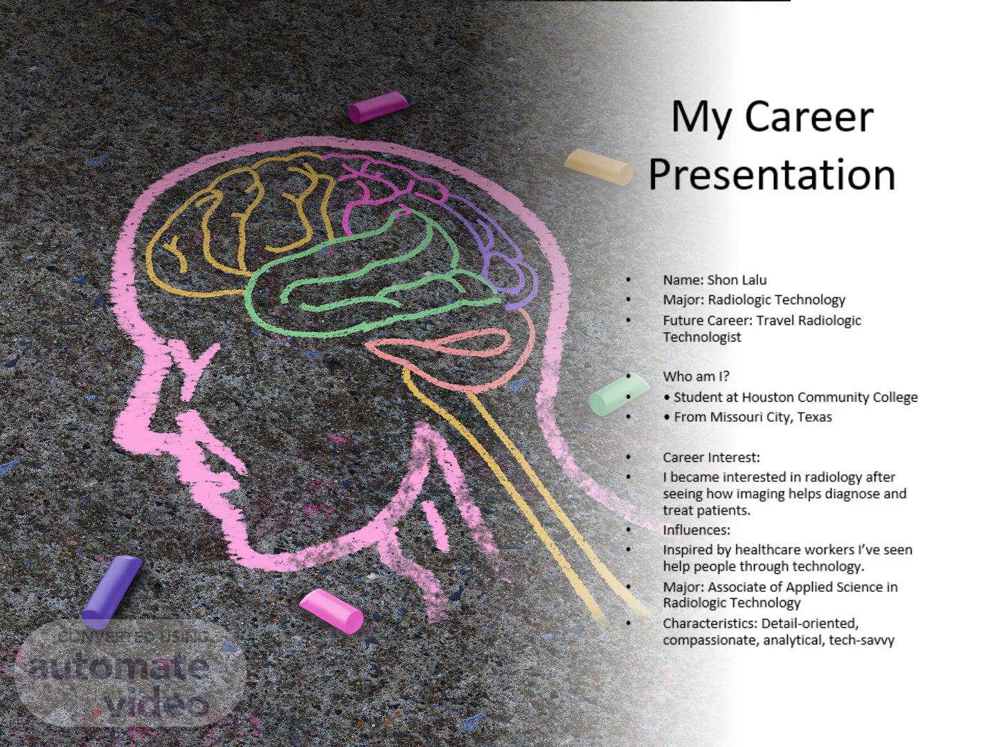 CAREER RESEARCH - SLIDE 3. Educational Goals: 1. Complete AAS in Radiologic Technology (HCC) 2. Pass ARRT certification exam 3. Gain clinical experience 4. Transition into a travel radiologic technologist role Financing: Pell Grants, Scholarships, Part-time Work.