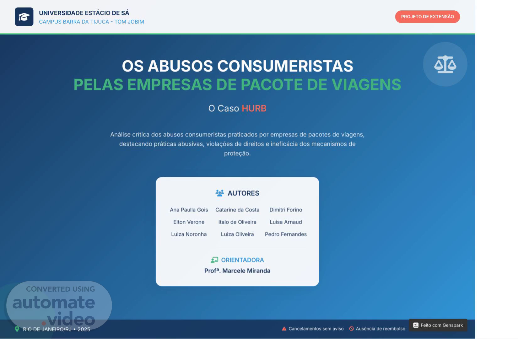 [Audio] UNIVERSIDADE ESTÁCIO DE SÁ PROJETO DE EXTENSÃO CAMPUS BARRA DA TIJUCA - TOM JOBIM ⚖ OS ABUSOS CONSUMERISTAS PELAS EMPRESAS DE PACOTE DE VIAGENS O Caso HURB Análise crítica dos abusos consumeristas praticados por empresas de pacotes de viagens, destacando práticas abusivas, violações de direitos e ineficácia dos mecanismos de proteção. AUTORES Ana Paulla Gois Catarine da Costa Dimitri Forino Elton Verone Italo de Oliveira Luisa Arnaud Luiza Noronha Luiza Oliveira Pedro Fernandes ORIENTADORA Profª. Marcele Miranda Feito com Genspark RIO DE JANEIRO/RJ 2025 ⚠ Cancelamentos sem aviso Ausência de reembolso Falta de assistência.