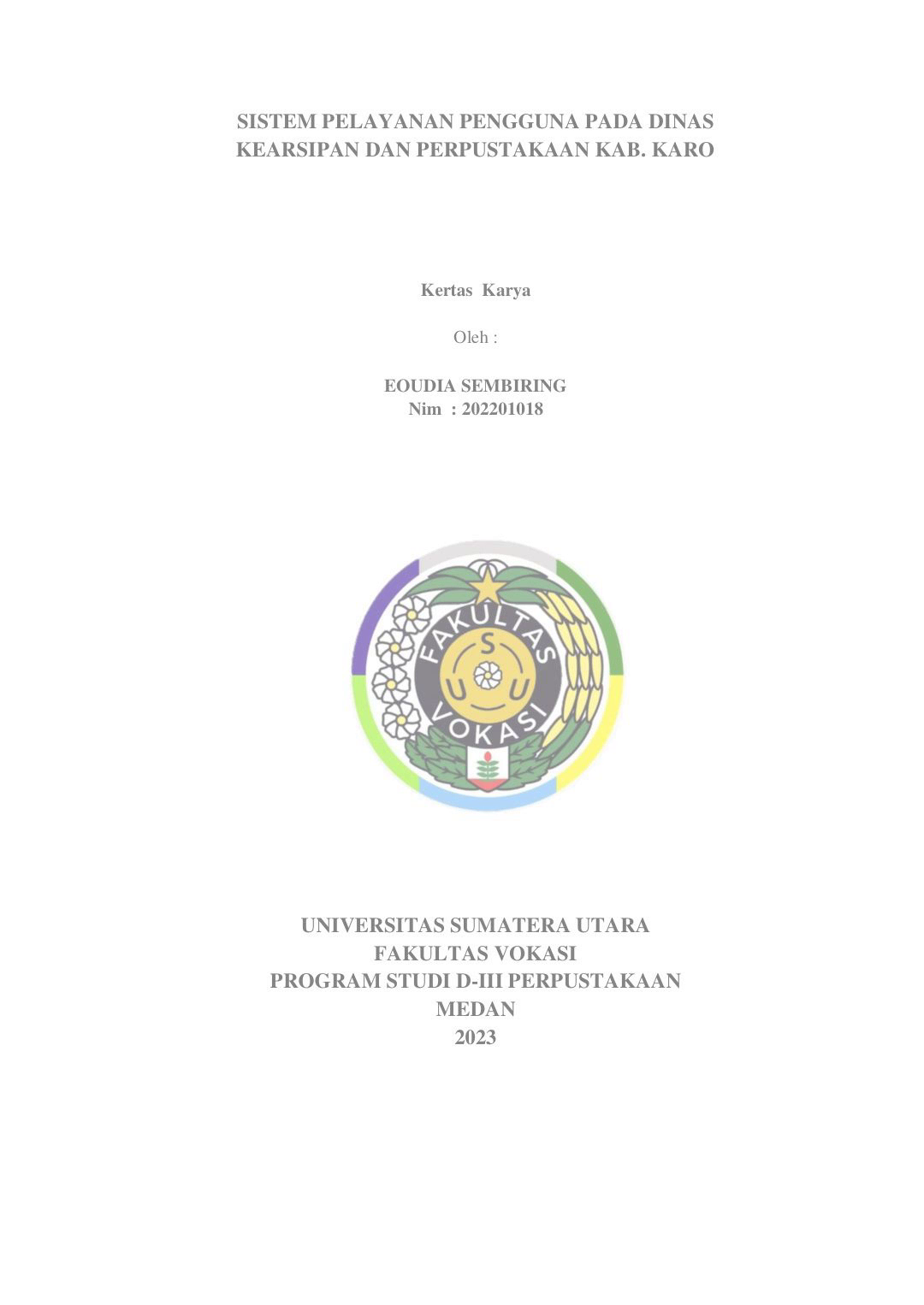 [Audio] SISTEM PELAYANAN PENGGUNA PADA DINAS KEARSIPAN DAN PERPUSTAKAAN KAB. KARO Kertas Karya Oleh : EOUDIA SEMBIRING Nim : 202201018 UNIVERSITAS SUMATERA UTARA FAKULTAS VOKASI PROGRAM STUDI D-III PERPUSTAKAAN MEDAN 2023.