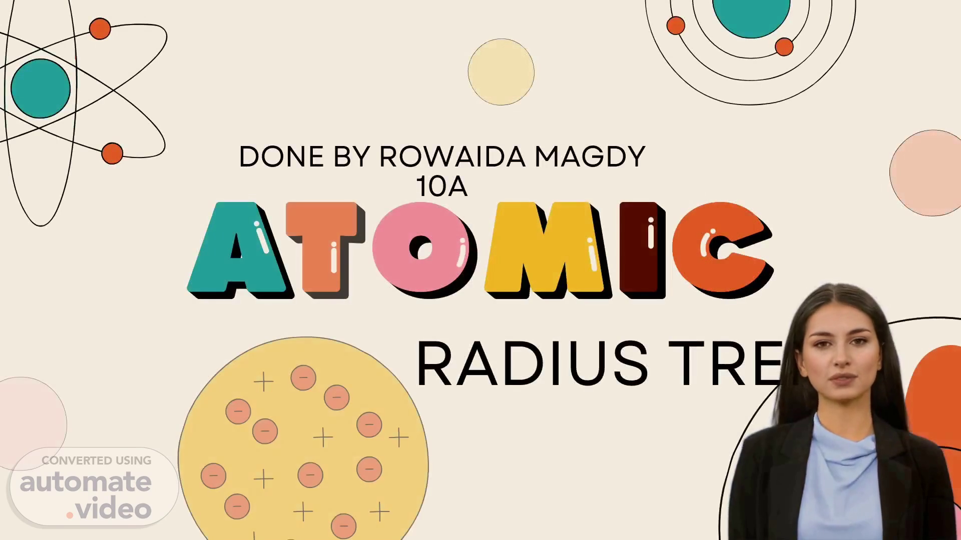 [Virtual Presenter] Welcome everyone. Today, we will be taking a look at the atomic radius trend done by Rowaida Magdy 10A. She has studied how the atomic radius changes as we move throughout the Periodic Table and will be presenting her findings to us. Let's get started..