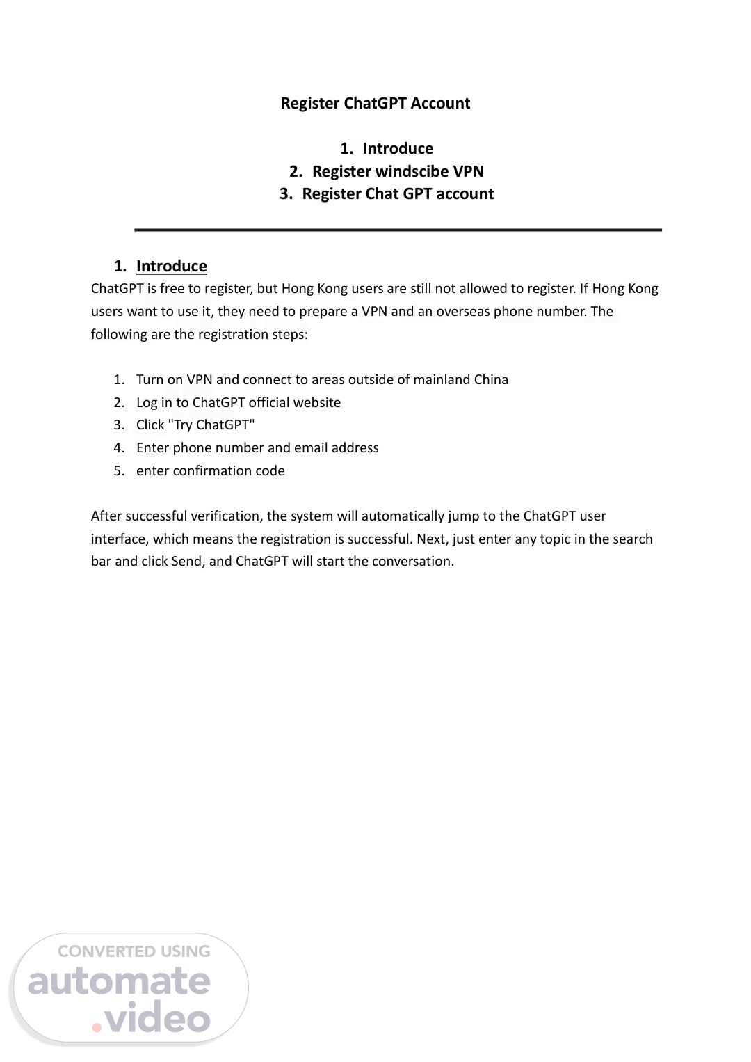 [Virtual Presenter] Register ChatGPT Account 1. Introduce 2. Register windscibe VPN 3. Register Chat GPT account 1. Introduce ChatGPT is free to register, but Hong Kong users are still not allowed to register. If Hong Kong users want to use it, they need to prepare a VPN and an overseas phone number. The following are the registration steps: 1. Turn on VPN and connect to areas outside of mainland China 2. Log in to ChatGPT official website 3. Click "Try ChatGPT" 4. Enter phone number and email address 5. enter confirmation code After successful verification, the system will automatically jump to the ChatGPT user interface, which means the registration is successful. Next, just enter any topic in the search bar and click Send, and ChatGPT will start the conversation..