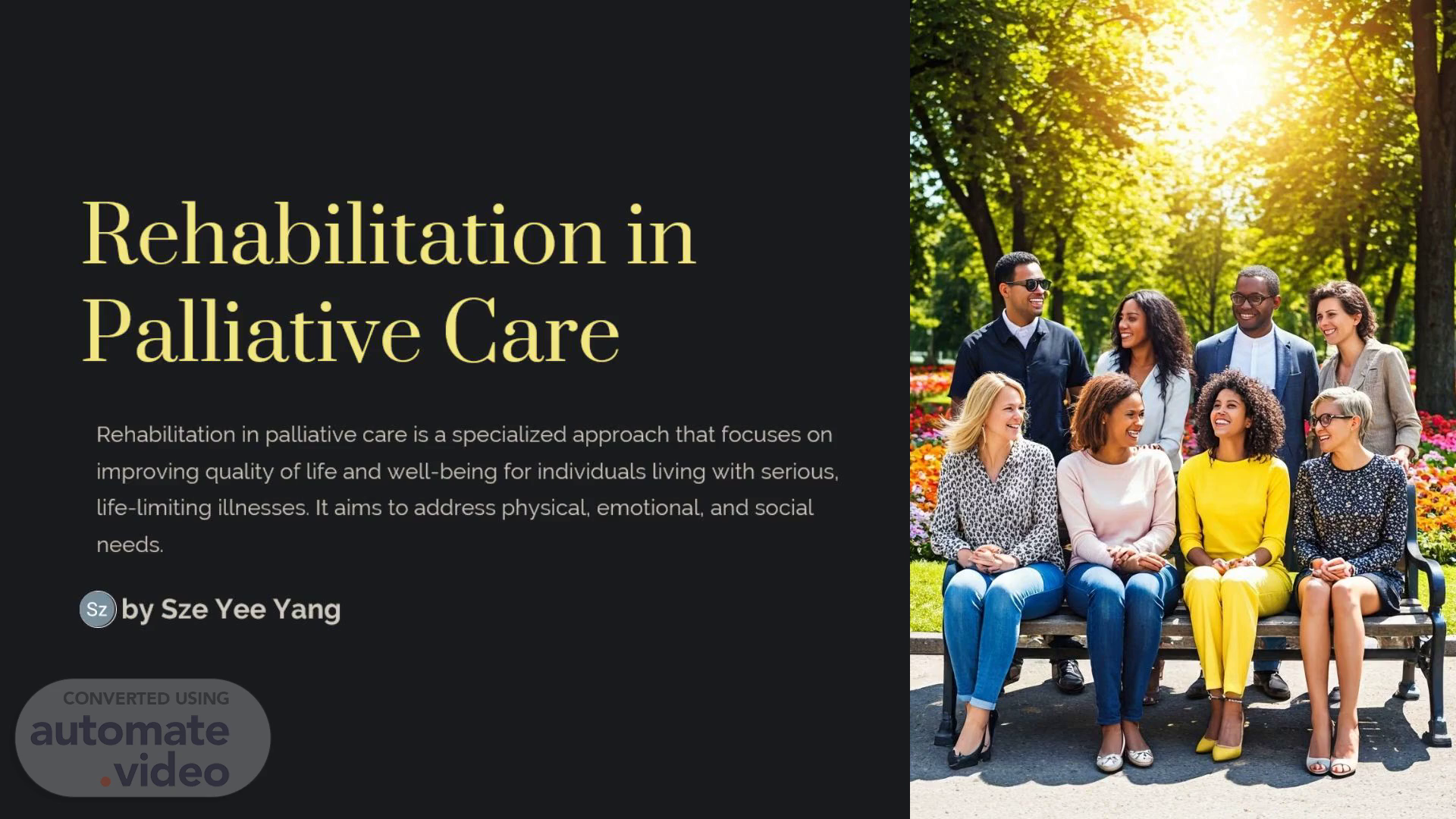 [Audio] Rehabilitation in palliative care is a specialized approach that focuses on improving quality of life and well-being for individuals living with serious, life-limiting illnesses. It aims to address physical, emotional, and social needs..