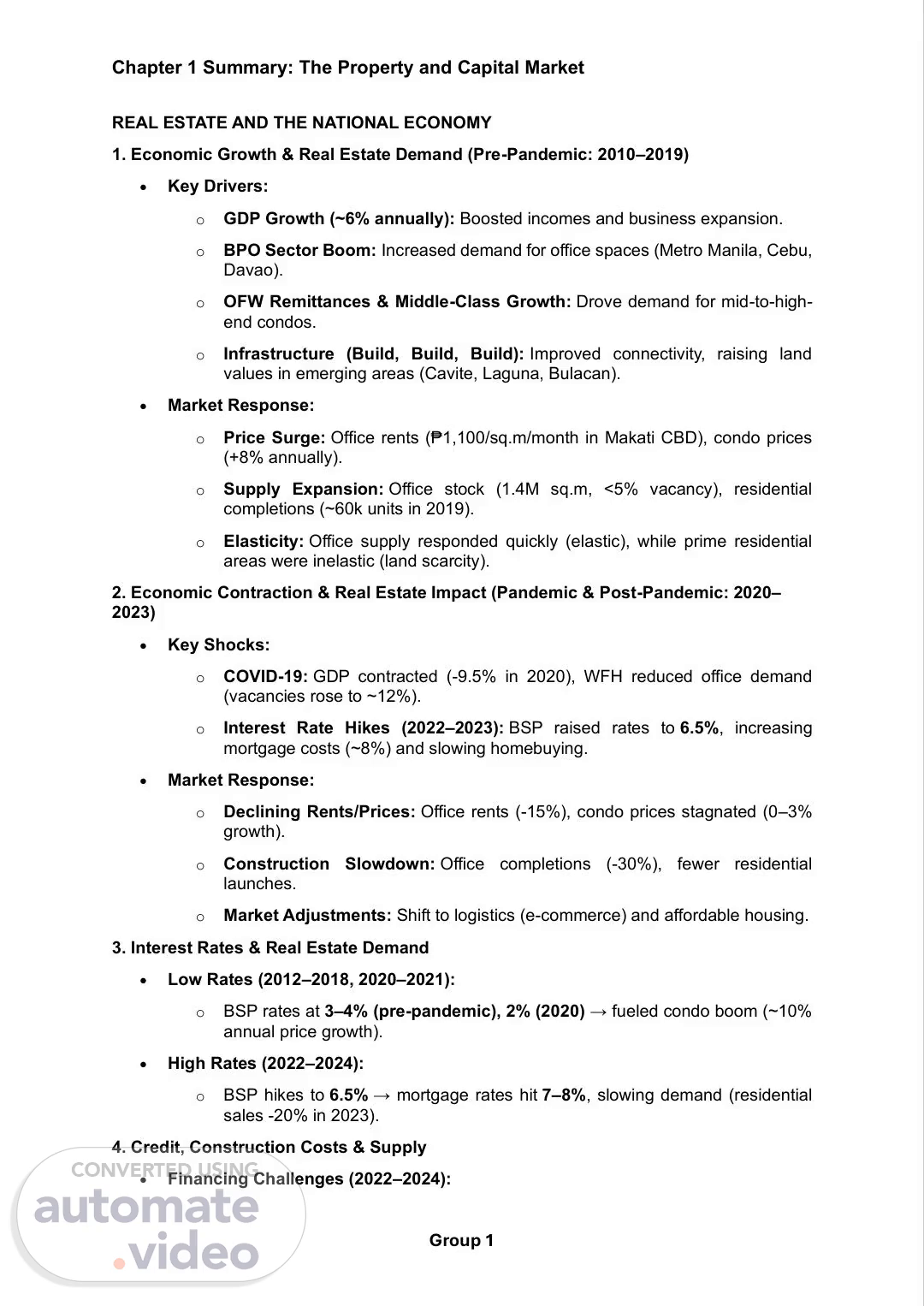 [Audio] Chapter 1 Summary: The Property and Capital Market REAL ESTATE AND THE NATIONAL ECONOMY 1. Economic Growth & Real Estate Demand (Pre-Pandemic: 2010–2019) Key Drivers: o GDP Growth (~6% annually): Boosted incomes and business expansion. o BPO Sector Boom: Increased demand for office spaces (Metro Manila, Cebu, Davao). o OFW Remittances & Middle-Class Growth: Drove demand for mid-to-highend condos. o Infrastructure (Build, Build, Build): Improved connectivity, raising land values in emerging areas (Cavite, Laguna, Bulacan). Market Response: o Price Surge: Office rents (₱1,100/sq.m/month in Makati CBD), condo prices (+8% annually). o Supply Expansion: Office stock (1.4M sq.m, <5% vacancy), residential completions (~60k units in 2019). o Elasticity: Office supply responded quickly (elastic), while prime residential areas were inelastic (land scarcity). 2. Economic Contraction & Real Estate Impact (Pandemic & Post-Pandemic: 2020– 2023) Key Shocks: o COVID-19: GDP contracted (-9.5% in 2020), WFH reduced office demand (vacancies rose to ~12%). o Interest Rate Hikes (2022–2023): BSP raised rates to 6.5%, increasing mortgage costs (~8%) and slowing homebuying. Market Response: o Declining Rents/Prices: Office rents (-15%), condo prices stagnated (0–3% growth). o Construction Slowdown: Office completions (-30%), fewer residential launches. o Market Adjustments: Shift to logistics (e-commerce) and affordable housing. 3. Interest Rates & Real Estate Demand Low Rates (2012–2018, 2020–2021): o BSP rates at 3–4% (pre-pandemic), 2% (2020) → fueled condo boom (~10% annual price growth). High Rates (2022–2024): o BSP hikes to 6.5% → mortgage rates hit 7–8%, slowing demand (residential sales -20% in 2023). 4. Credit, Construction Costs & Supply Financing Challenges (2022–2024): Group 1.