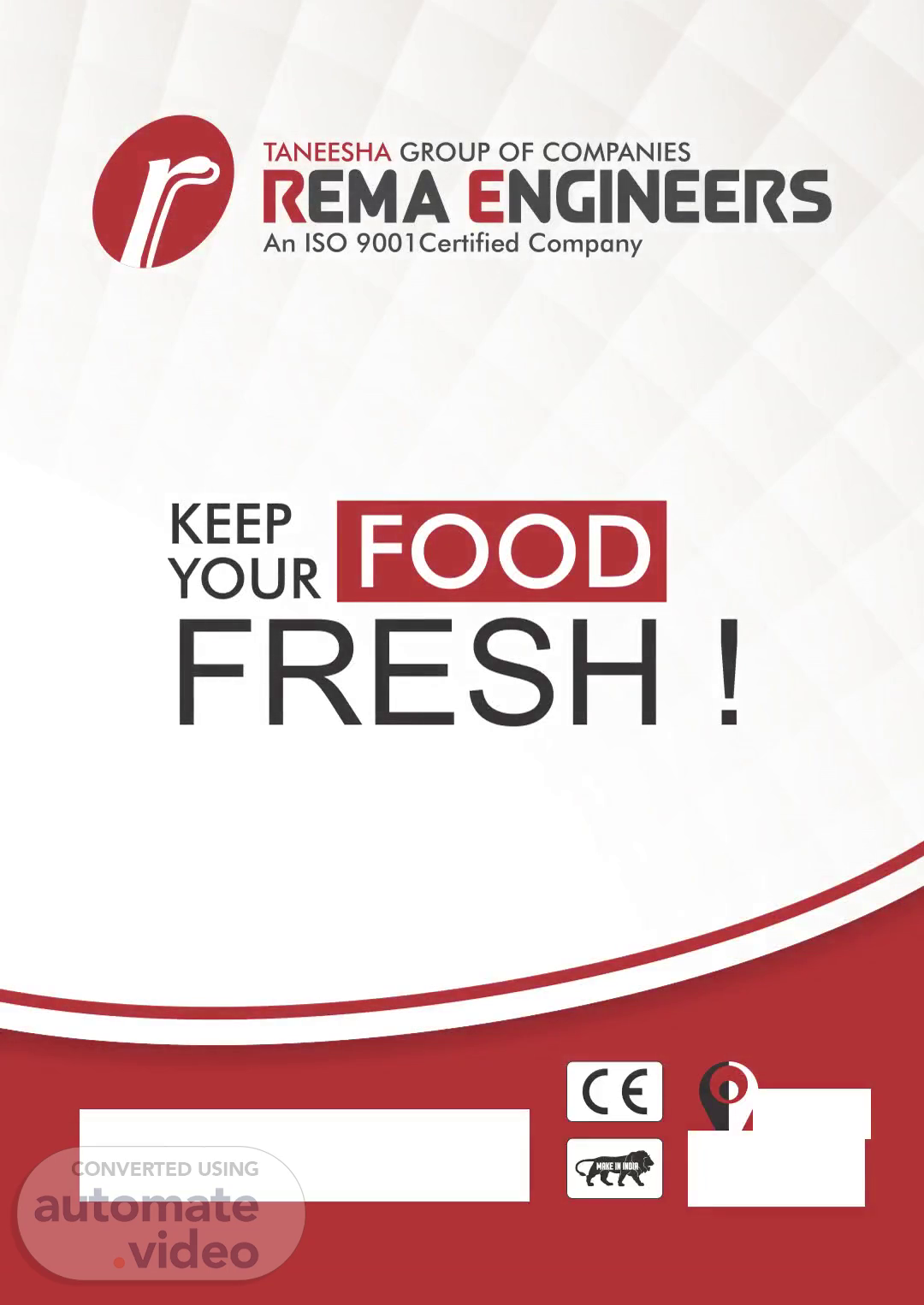 . . 200mmX310mm 1 kg & 2 kg 140mmX105mm 250 gm 120 mm 500 ml 220mmX165mm 500 gm 84mm 125 ml & 250 ml 200 mm 500 gm Standard Features Technical Specification Down Chamber Height Max Diameter of Film Roll Control Panel Electric Supply Vacuum pump Vacuum Required Cycles per Minute Operating on Trays Machine Construction Machine Weight Machine Dimension Optional Features REMA-7878-MAP 60 mm 220mm PLC, HMI Mitsubishi 41 5V-3Ph-50Hz, 5KW (Other Voltages Also Available) (Busch/BeckefrGermany) 99.50% 1 to 3 Vacuum+Gas+Sealing +Cutting Stainless Steel 220 Kg Ll 080xW980xH1430mm Bottom Chamber Height Can be Increased Up to 150mm for Bigger Tray Heights Eye mark sensors for printed rolls 4.