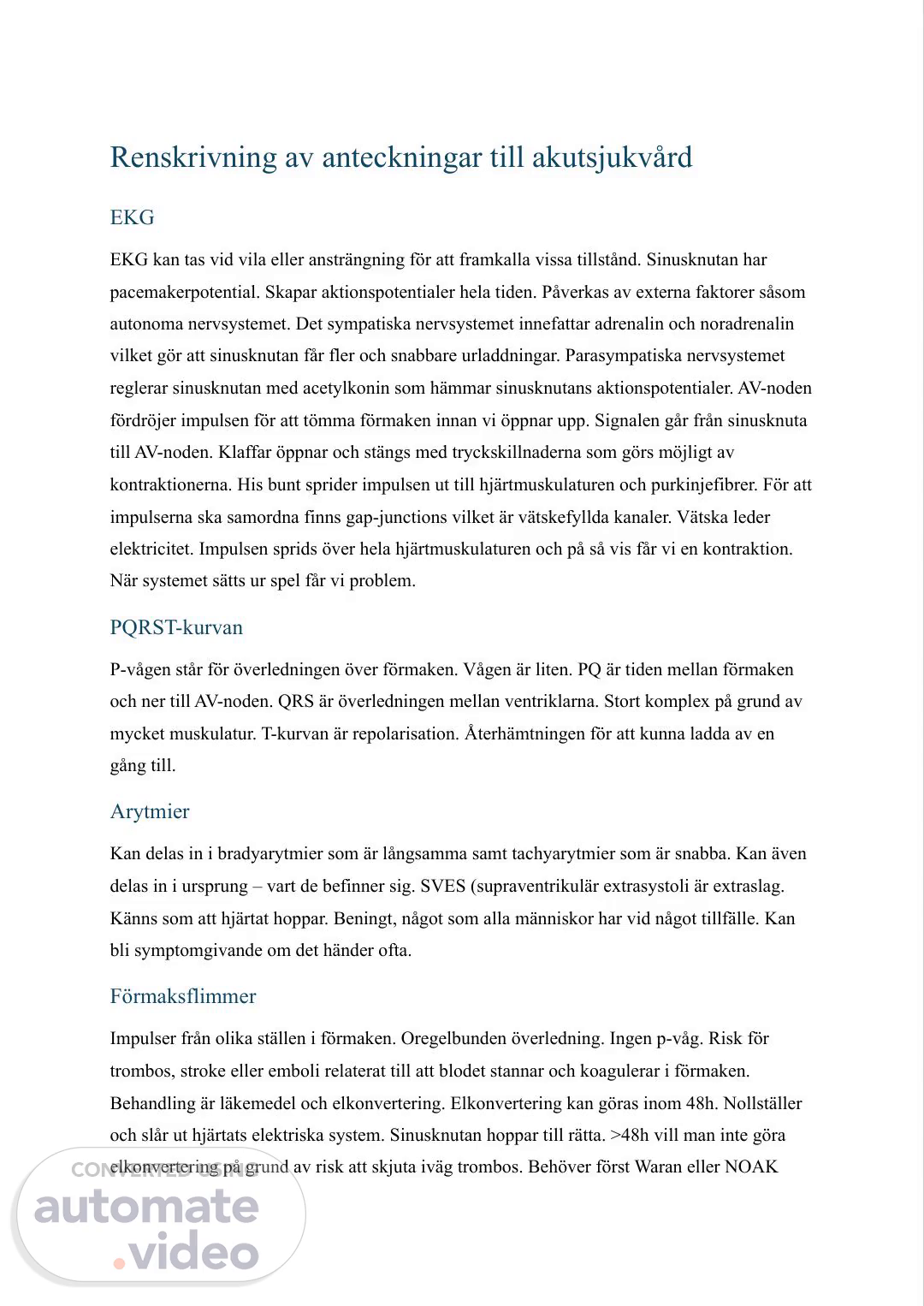 [Audio] Renskrivning av anteckningar till akutsjukvård EKG EKG kan tas vid vila eller ansträngning för att framkalla vissa tillstånd. Sinusknutan har pacemakerpotential. Skapar aktionspotentialer hela tiden. Påverkas av externa faktorer såsom autonoma nervsystemet. Det sympatiska nervsystemet innefattar adrenalin och noradrenalin vilket gör att sinusknutan får fler och snabbare urladdningar. Parasympatiska nervsystemet reglerar sinusknutan med acetylkonin som hämmar sinusknutans aktionspotentialer. AV-noden fördröjer impulsen för att tömma förmaken innan vi öppnar upp. Signalen går från sinusknuta till AV-noden. Klaffar öppnar och stängs med tryckskillnaderna som görs möjligt av kontraktionerna. His bunt sprider impulsen ut till hjärtmuskulaturen och purkinjefibrer. För att impulserna ska samordna finns gap-junctions vilket är vätskefyllda kanaler. Vätska leder elektricitet. Impulsen sprids över hela hjärtmuskulaturen och på så vis får vi en kontraktion. När systemet sätts ur spel får vi problem. PQRST-kurvan P-vågen står för överledningen över förmaken. Vågen är liten. PQ är tiden mellan förmaken och ner till AV-noden. QRS är överledningen mellan ventriklarna. Stort komplex på grund av mycket muskulatur. T-kurvan är repolarisation. Återhämtningen för att kunna ladda av en gång till. Arytmier Kan delas in i bradyarytmier som är långsamma samt tachyarytmier som är snabba. Kan även delas in i ursprung – vart de befinner sig. SVES (supraventrikulär extrasystoli är extraslag. Känns som att hjärtat hoppar. Beningt, något som alla människor har vid något tillfälle. Kan bli symptomgivande om det händer ofta. Förmaksflimmer Impulser från olika ställen i förmaken. Oregelbunden överledning. Ingen p-våg. Risk för trombos, stroke eller emboli relaterat till att blodet stannar och koagulerar i förmaken. Behandling är läkemedel och elkonvertering. Elkonvertering kan göras inom 48h. Nollställer och slår ut hjärtats elektriska system. Sinusknutan hoppar till rätta. >48h vill man inte göra elkonvertering på grund av risk att skjuta iväg trombos. Behöver först Waran eller NOAK.