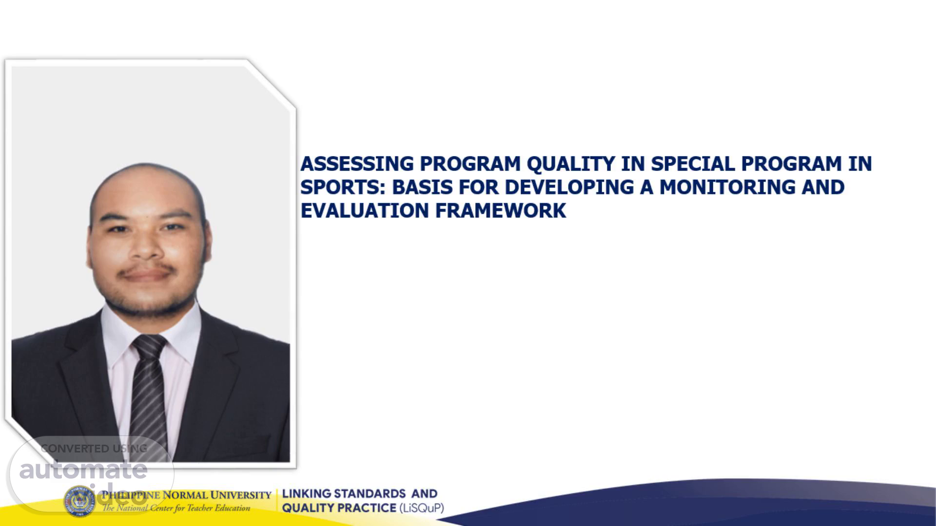 [Audio] Data Sources: Surveys and questionnaires allow for gathering information from multiple perspectives, including students, teacher-specialists, and school heads. Existing data can provide additional insights into program implementation and outcomes. Observations of SPS activities offer a more nuanced understanding of the program's day-to-day operations. Focus groups and interviews provide an opportunity to gather more in-depth information from stakeholders. Tools for Validation: Content validity is important in ensuring that the indicators and metrics used to measure the SPS are relevant and meaningful to the field of sports education. A panel of experts can validate the indicators and metrics by reviewing them against established standards and best practices. Face validity is also important to ensure that the framework is perceived as relevant and meaningful by stakeholders. Triangulation of data sources helps to increase confidence in the findings and reduce potential biases. Validators: The validators for this study will comprise a diverse group of stakeholders who will provide expert input, practical insights, and personal experiences to ensure the robustness and relevance of the framework. The Expert Panel will consist of Professors from the Institute of Human Kinetics, Visayas State University (VSU), who will bring their expertise in sports education to the table, providing a rigorous review of the indicators and metrics. Additionally, the Regional MAPEH Supervisor and Division's Supervisor will offer a broader perspective on the implementation of the Special Program in Sports (SPS) and its impact on students and schools. The stakeholders' group will include student-athletes who have participated in the SPS, providing firsthand experiences and perspectives on the program's effectiveness. SPS Specialists/Coaches will offer insights into the program's delivery and potential areas for improvement, while parents of student-athletes who have participated in the SPS will provide a parent's-eye view of the program's impact on their children. Their input can help refine indicators and metrics, increase their validity and reliability, and ultimately improve the overall quality of the research..
