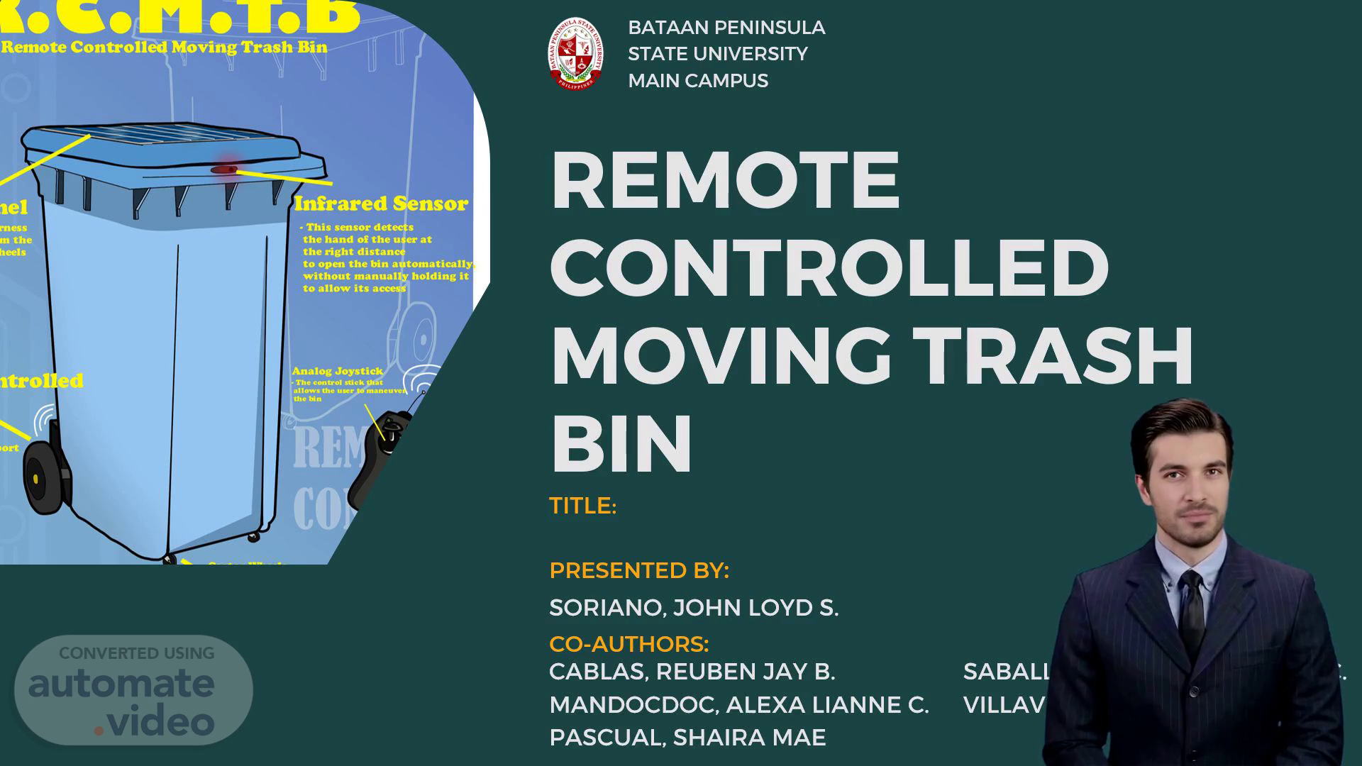 [Virtual Presenter] Good morning, everyone. Today, we are proud to present our project, the Remote-Controlled Moving Trash Bin. Our team is composed of Reuben Jay B. Cablas, Alexa Lianne C. Mandocdoc, Shaira Mae Pascual, Keizer Chariz C. Saballeque, and Ruslyn G. Villaviray. The project is spearheaded by John Loyd S. Soriano. We hope that we can provide an easier and more efficient way of disposing of our trash..