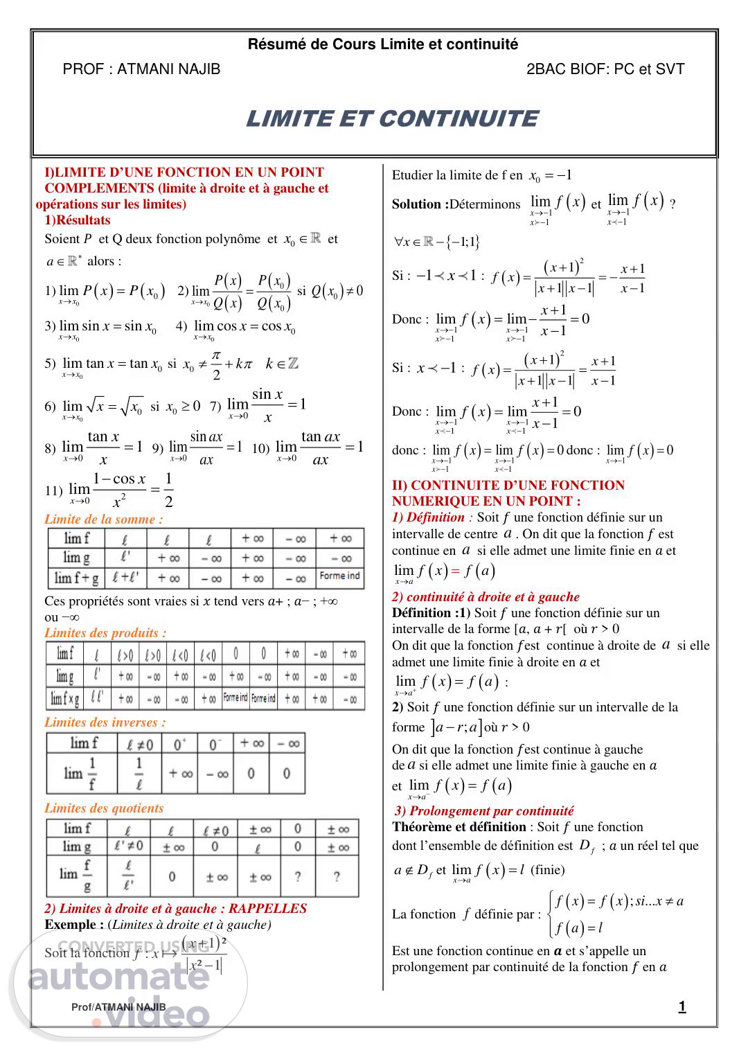 Prof/ATMANI NAJIB 1 Résumé de Cours Limite et continuité PROF : ATMANI NAJIB 2BAC BIOF: PC et SVT I)LIMITE D’UNE FONCTION EN UN POINT COMPLEMENTS (limite à droite et à gauche et opérations sur les limites) 1)Résultats Soient 𝑃 et Q deux fonction polynôme et 0x et a alors : 1) 0 0 lim x x P x P x 2) 0 0 0 lim x x P x P x Q x Q x si 0 0 Q x 3) 0 0 lim sin sin x x x x 4) 0 0 lim cos cos x x x x 5) 0 0 lim tan tan x x x x si 0 2 x k k 6) 0 0 lim x x x x si 0 x 0 7) 0 lim sin 1 x x x 8) 0 lim tan 1 x x x 9) 0 lim sin 1 x ax ax 10) 0 lim tan 1 x ax ax 11) 2 0 1 cos 1 lim 2 x x x Limite de la somme : Ces propriétés sont vraies si 𝑥 tend vers 𝑎+ ; 𝑎− ; +∞ ou −∞ Limites des produits : Limites des inverses : Limites des quotients 2) Limites à droite et à gauche : RAPPELLES Exemple : (Limites à droite et à gauche) Soit la fonction 1 ² : ² 1 x f x x Etudier la limite de f en 0 1 x Solution :Déterminons 1 1 lim x x f x et 1 1 lim x x f x ? 1;1 x Si : 1 1 x : 1 2 1 1 1 1 x x f x x x x Donc : 1 1 1 1 1 lim lim 0 1 x x x x x f x x Si : 1 x : 1 2 1 1 1 1 x x f x x x x Donc : 1 1 1 1 1 lim lim 0 1 x x x x x f x x donc : 1 1 1 1 lim lim 0 x x x x f x f x donc : 1 lim 0 x f x II) CONTINUITE D’UNE FONCTION NUMERIQUE EN UN POINT : 1) Définition : Soit 𝑓 une fonction définie sur un intervalle de centre a . On dit que la fonction 𝑓 est continue en a si elle admet une limite finie en 𝑎 et lim x a f x f a 2) continuité à droite et à gauche Définition :1) Soit 𝑓 une fonction définie sur un intervalle de la forme [𝑎, 𝑎 + 𝑟[ où 𝑟 > 0 On dit que la fonction 𝑓est continue à droite de a si elle admet une limite finie à droite en 𝑎 et lim x a f x f a : 2) Soit 𝑓 une fonction définie sur un intervalle de la forme ; a r a où 𝑟 > 0 On dit que la fonction 𝑓est continue à gauche de a si elle admet une limite finie à gauche en 𝑎 et lim x a f x f a 3) Prolongement par continuité Théorème et définition : Soit 𝑓 une fonction dont l’ensemble de définition est f D ; 𝑎 un réel tel que f a D et lim x a f x l (finie) La fonction f définie par : ; ... f x f x si x a f a l Est une fonction continue en 𝒂 et s’appelle un prolongement par continuité de la fonction 𝑓 en 𝑎 LIMITE ET CONTINUITE.