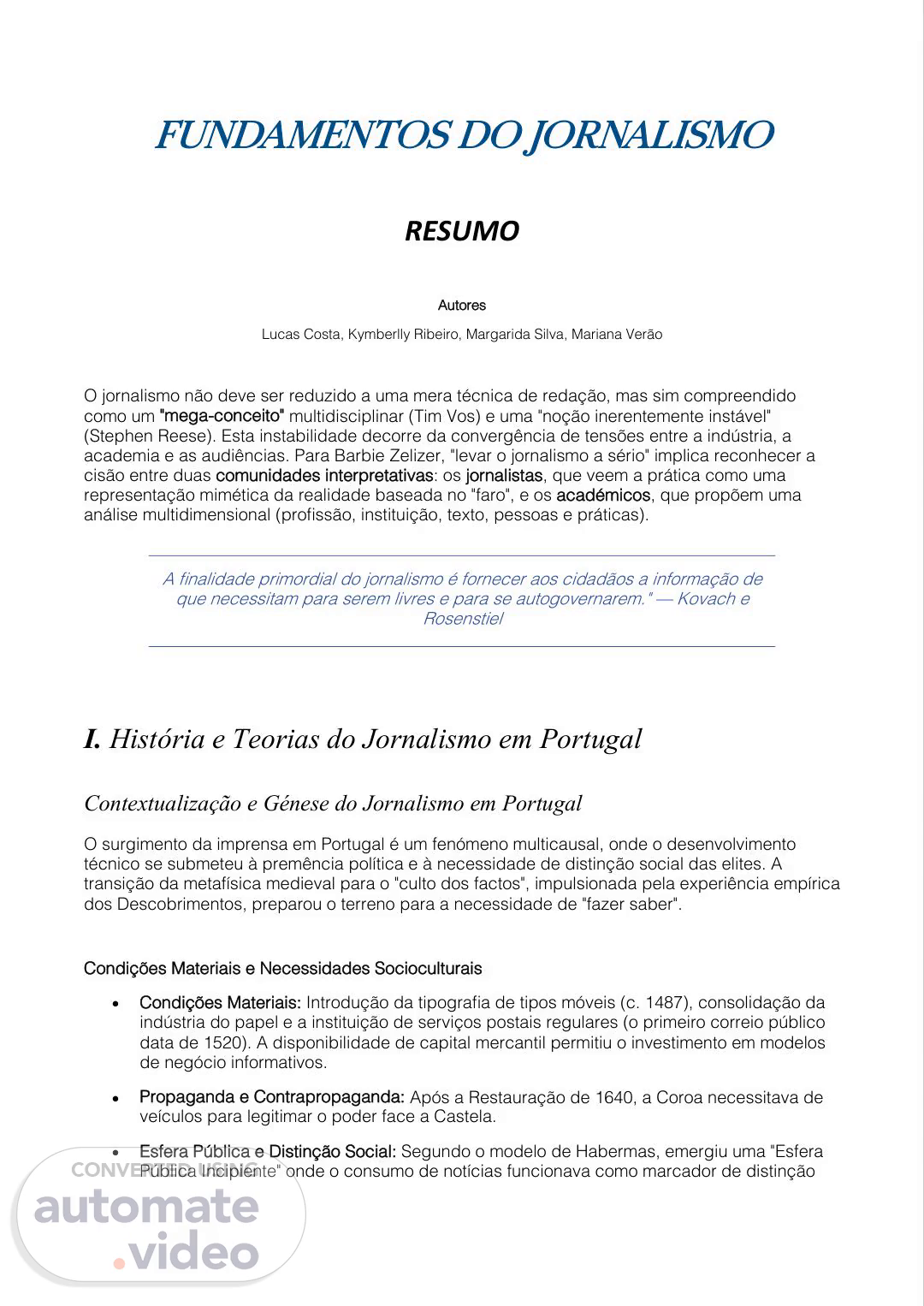 [Audio] Fundamentos Do Jornalismo Resumo Autores Lucas Costa, Kymberlly Ribeiro, Margarida Silva, Mariana Verão O jornalismo não deve ser reduzido a uma mera técnica de redação, mas sim compreendido como um "mega conceito" multidisciplinar (Tim Vos) e uma "noção inerentemente instável" (Stephen Reese). Esta instabilidade decorre da convergência de tensões entre a indústria, a academia e as audiências. Para Barbie Zelizer, "levar o jornalismo a sério" implica reconhecer a cisão entre duas comunidades interpretativas: os jornalistas, que veem a prática como uma representação mimética da realidade baseada no "faro", e os académicos, que propõem uma análise multidimensional (profissão, instituição, texto, pessoas e práticas). A finalidade primordial do jornalismo é fornecer aos cidadãos a informação de que necessitam para serem livres e para se autogovernarem." — Kovach e Rosenstiel I História e Teorias do Jornalismo em Portugal Contextualização e Génese do Jornalismo em Portugal O surgimento da imprensa em Portugal é um fenómeno multicausal, onde o desenvolvimento técnico se submeteu à premência política e à necessidade de distinção social das elites. A transição da metafísica medieval para o "culto dos factos", impulsionada pela experiência empírica dos Descobrimentos, preparou o terreno para a necessidade de "fazer saber". Condições Materiais e Necessidades Socioculturais Condições Materiais: Introdução da tipografia de tipos móveis (c. 1487), consolidação da indústria do papel e a instituição de serviços postais regulares (o primeiro correio público data de 1520). A disponibilidade de capital mercantil permitiu o investimento em modelos de negócio informativos. Propaganda e Contrapropaganda: Após a Restauração de 1640, a Coroa necessitava de veículos para legitimar o poder face a Castela. Esfera Pública e Distinção Social: Segundo o modelo de Habermas, emergiu uma "Esfera Pública Incipiente" onde o consumo de notícias funcionava como marcador de distinção.