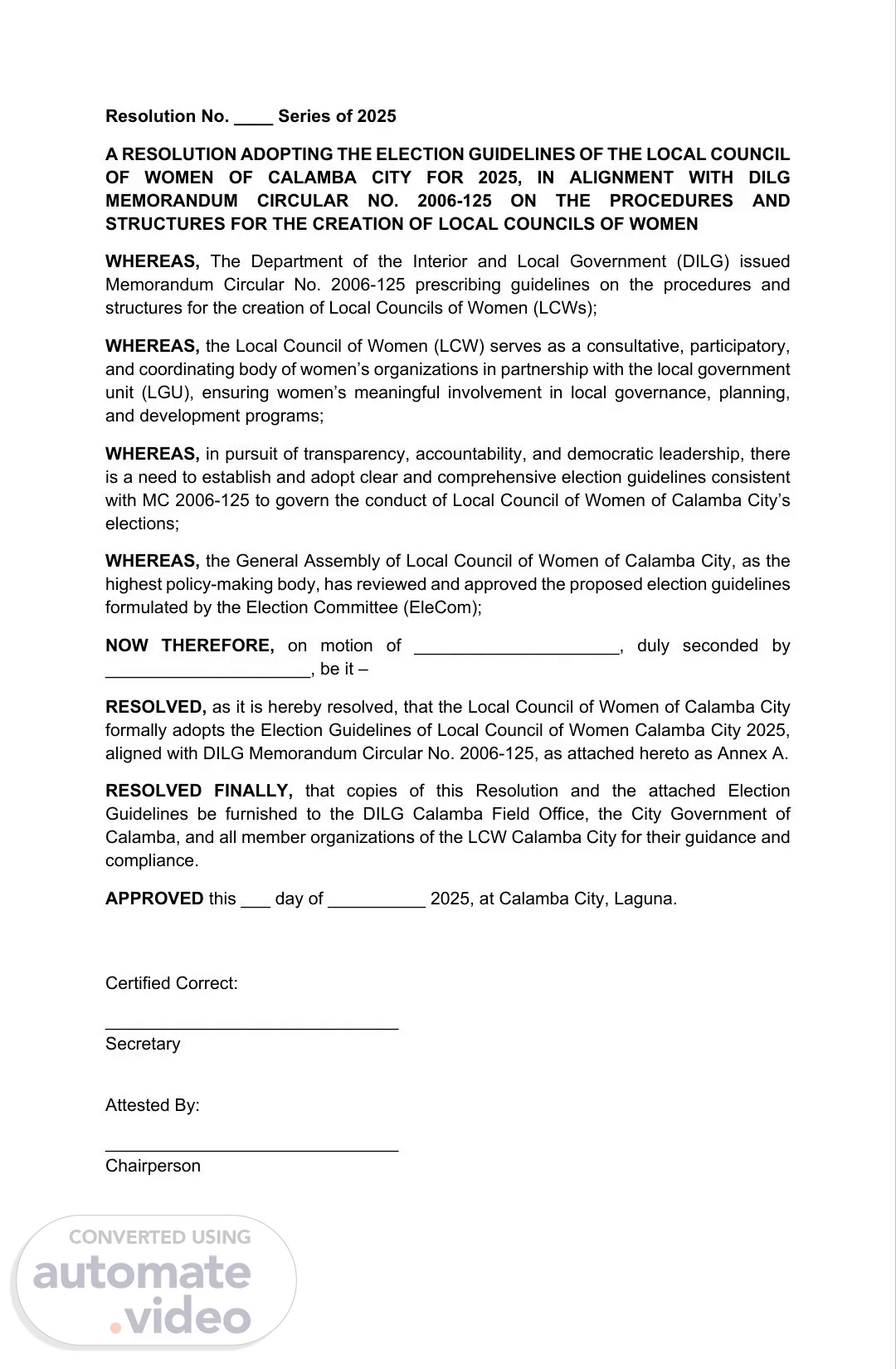 Resolution No. ____ Series of 2025 A RESOLUTION ADOPTING THE ELECTION GUIDELINES OF THE LOCAL COUNCIL OF WOMEN OF CALAMBA CITY FOR 2025, IN ALIGNMENT WITH DILG MEMORANDUM CIRCULAR NO. 2006-125 ON THE PROCEDURES AND STRUCTURES FOR THE CREATION OF LOCAL COUNCILS OF WOMEN WHEREAS, The Department of the Interior and Local Government (DILG) issued Memorandum Circular No. 2006-125 prescribing guidelines on the procedures and structures for the creation of Local Councils of Women (LCWs); WHEREAS, the Local Council of Women (LCW) serves as a consultative, participatory, and coordinating body of women’s organizations in partnership with the local government unit (LGU), ensuring women’s meaningful involvement in local governance, planning, and development programs; WHEREAS, in pursuit of transparency, accountability, and democratic leadership, there is a need to establish and adopt clear and comprehensive election guidelines consistent with MC 2006-125 to govern the conduct of Local Council of Women of Calamba City’s elections; WHEREAS, the General Assembly of Local Council of Women of Calamba City, as the highest policy-making body, has reviewed and approved the proposed election guidelines formulated by the Election Committee (EleCom); NOW THEREFORE, on motion of _____________________, duly seconded by _____________________, be it – RESOLVED, as it is hereby resolved, that the Local Council of Women of Calamba City formally adopts the Election Guidelines of Local Council of Women Calamba City 2025, aligned with DILG Memorandum Circular No. 2006-125, as attached hereto as Annex A. RESOLVED FINALLY, that copies of this Resolution and the attached Election Guidelines be furnished to the DILG Calamba Field Office, the City Government of Calamba, and all member organizations of the LCW Calamba City for their guidance and compliance. APPROVED this ___ day of __________ 2025, at Calamba City, Laguna. Certified Correct: ______________________________ Secretary Attested By: ______________________________ Chairperson.