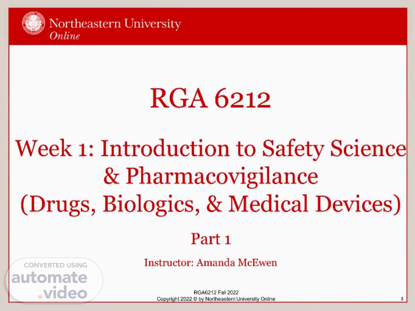 RGA6212 Fall 2022 Copyright 2022 © by Northeastern University Online 1 RGA 6212 Week 1: Introduction to Safety Science & Pharmacovigilance (Drugs, Biologics, & Medical Devices) Part 1 Instructor: Amanda McEwen.