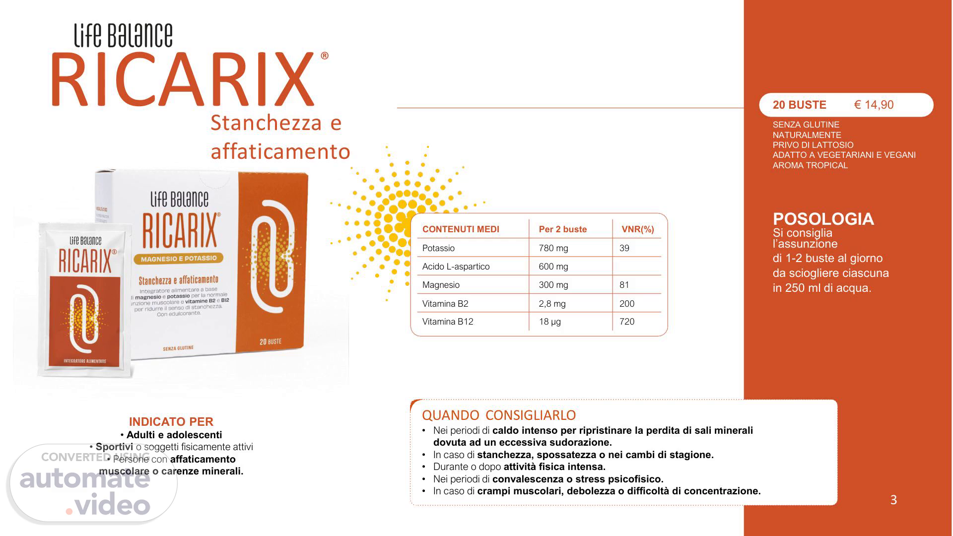 [Audio] ® 20 BUSTE € 14,90 Stanchezza e affaticamento RICARIX SENZA GLUTINE NATURALMENTE PRIVO DI LATTOSIO ADATTO A VEGETARIANI E VEGANI AROMA TROPICAL CONTENUTI MEDI Per 2 buste VNR(%) Potassio 780 mg 39 Acido L-aspartico 600 mg Magnesio 300 mg 81 POSOLOGIA Si consiglia l'assunzione di 1-2 buste al giorno da sciogliere ciascuna in 250 ml di acqua. Vitamina B2 2,8 mg 200 Vitamina B12 18 µg 720 INDICATO PER QUANDO CONSIGLIARLO Nei periodi di caldo intenso per ripristinare la perdita di sali minerali Adulti e adolescenti dovuta ad un eccessiva sudorazione. Sportivi o soggetti fisicamente attivi Persone con affaticamento muscolare o carenze minerali. In caso di stanchezza, spossatezza o nei cambi di stagione. Durante o dopo attività fisica intensa. Nei periodi di convalescenza o stress psicofisico. In caso di crampi muscolari, debolezza o difficoltà di concentrazione. 3.