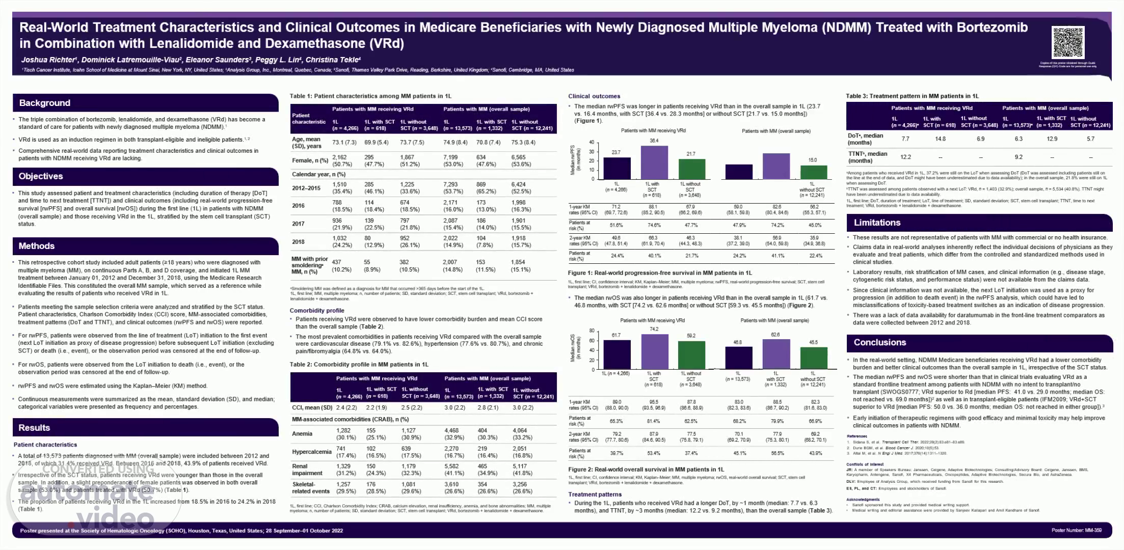 Real-World Treatment Characteristics and Clinical Outcomes in Medicare Beneficiaries with Newly Diagnosed Multiple Myeloma (NDMM) Treated with Bortezomib in Combination with Lenalidomide and Dexamethasone (VRd) Joshua Richter 1 , Dominick Latremouille-Viau 2 , Eleanor Saunders 3 , Peggy L. Lin 4 , Christina Tekle 4.